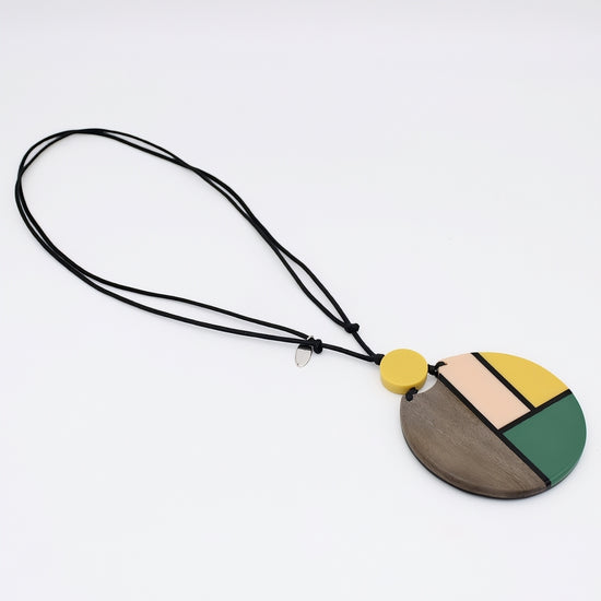 This artesian handcrafted round pendant necklace will be your new go-to necklace. The color block design features a neutral color palette that will pair well with any outfit. The adjustable black wax cord lets you wear this pendant at any length you choose. Wear alone or with coordinating earrings; either way you can’t go wrong.