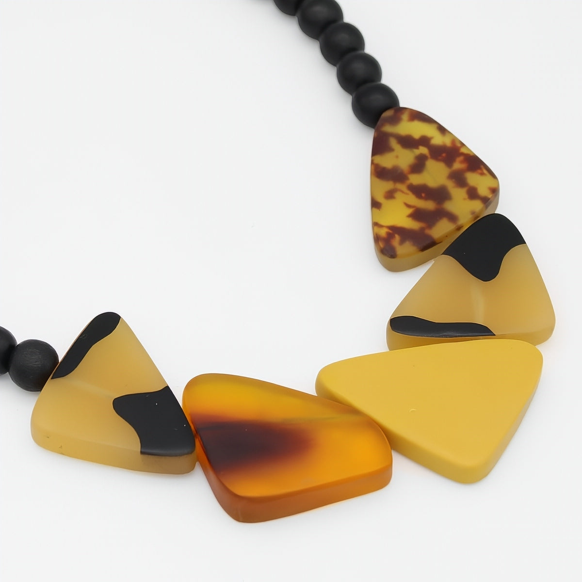 This elegant Amber Classic Bead Statement Necklace combines amber-toned geometric beads with brown and black accents and refined black round accents, creating a striking yet sophisticated look. Its adjustable length allows for versatile styling, making it the perfect accessory to enhance both casual and formal outfits.