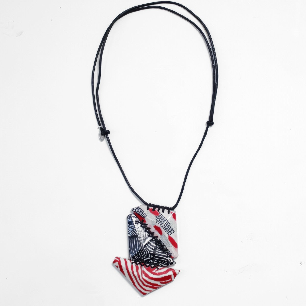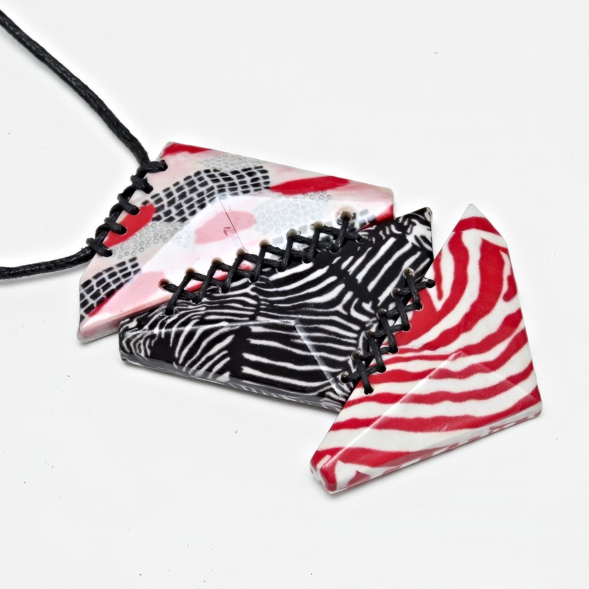 This handcrafted wooden pendant features multiple geometric shapes that are hand stitched together in a unique arrow like design. The beads are wrapped in an abstract decoupage design featuring colors such as black, white, red and pink. Hung on an adjustable black wax cord, you can choose the length your prefer. Layer over a solid dress or shirt and let the necklace stand out!