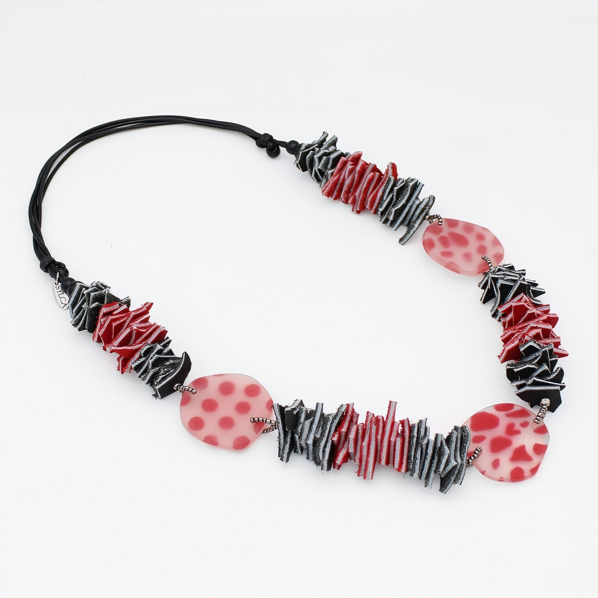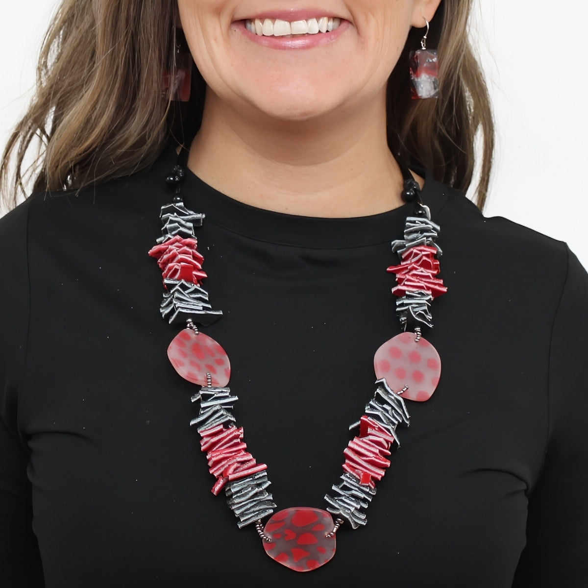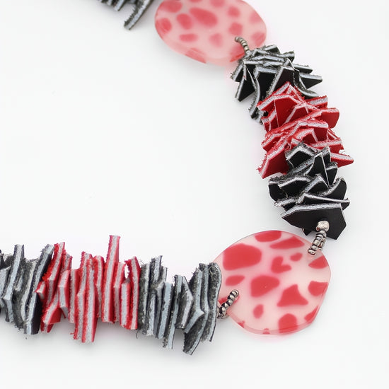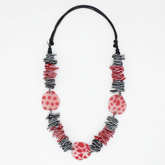 Make a fashion-forward statement with this stunning mixed media necklace. Black and red cut leather pieces are artfully stacked together and interspersed with frosted red speckled resin beads, creating a sophisticated blend of textures and materials that's sure to turn heads.