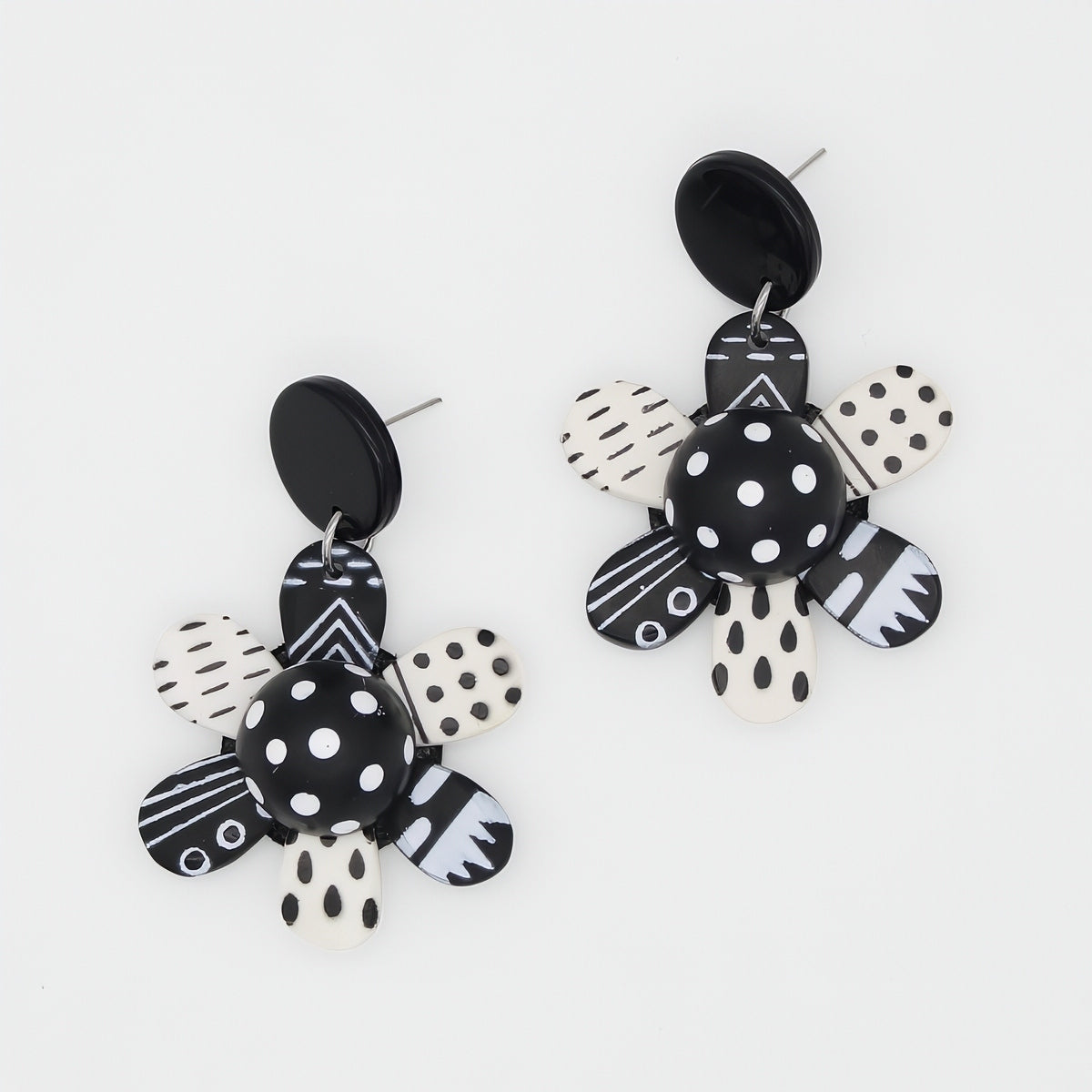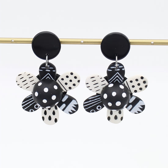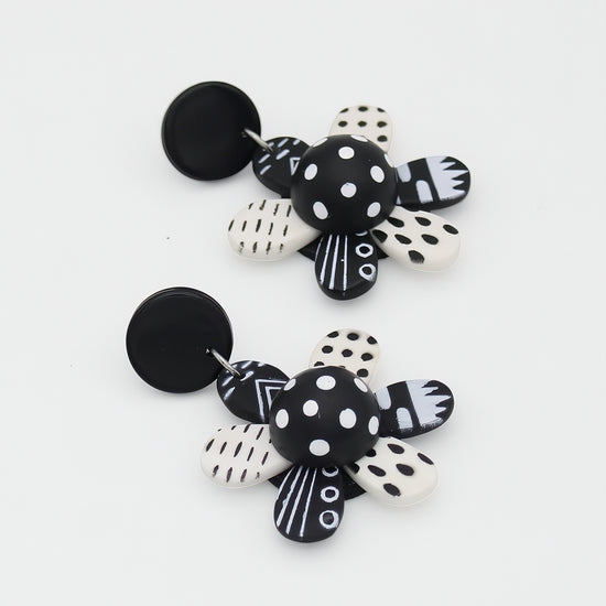 Black and White Garden of Color Flower Earrings - Hand-Painted Resin Drop Earrings