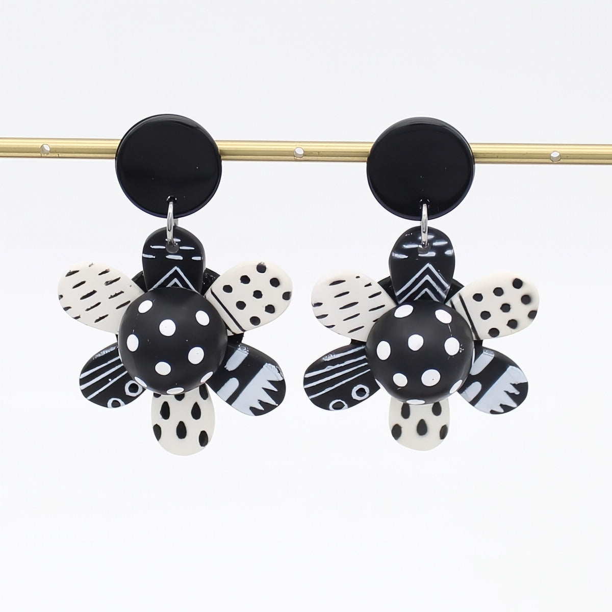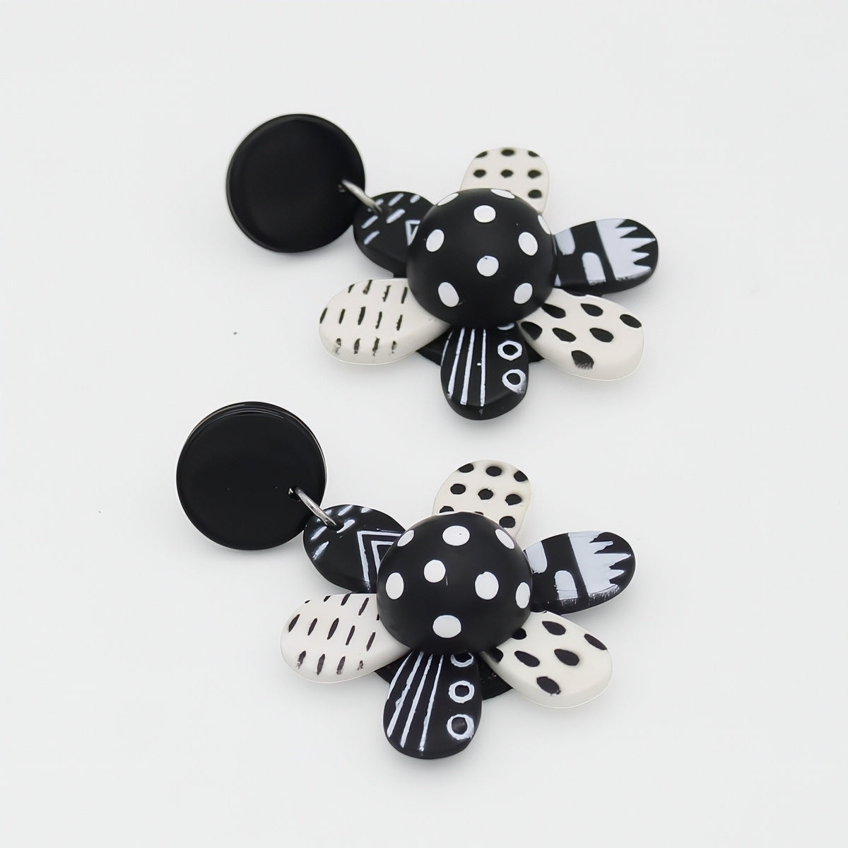 Black and White Garden of Color Flower Earrings bring playful sophistication to your jewelry collection with hand-painted resin blooms featuring whimsical polka dots and stripes in a striking black and white palette. These lightweight statement earrings add artisan charm to any outfit, from casual weekend looks to evening ensembles.