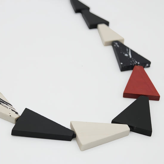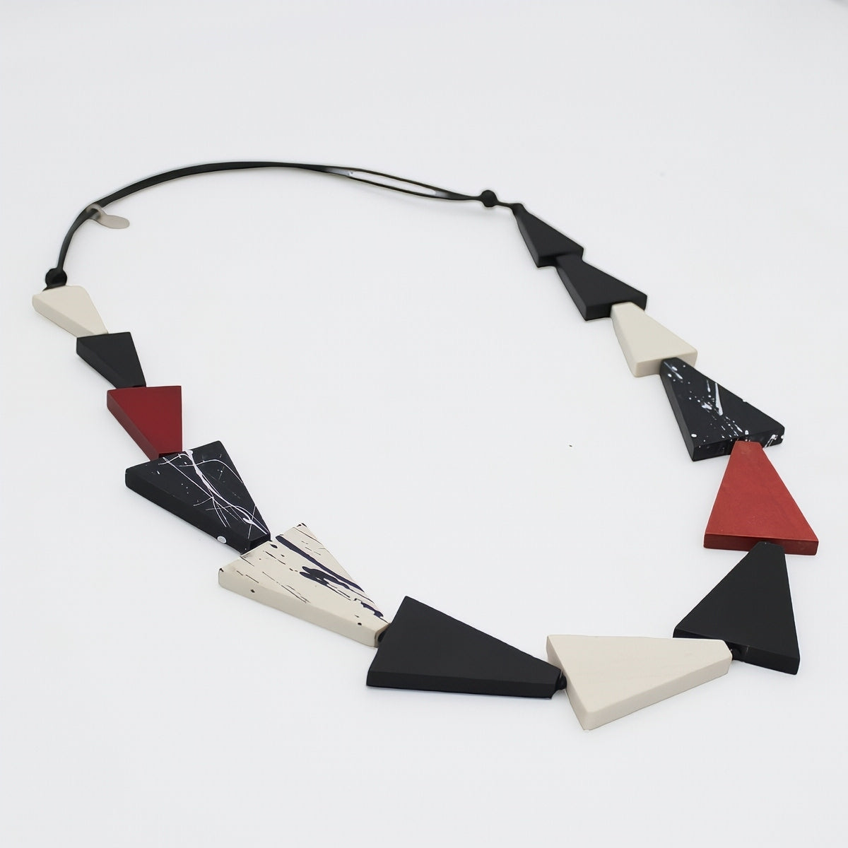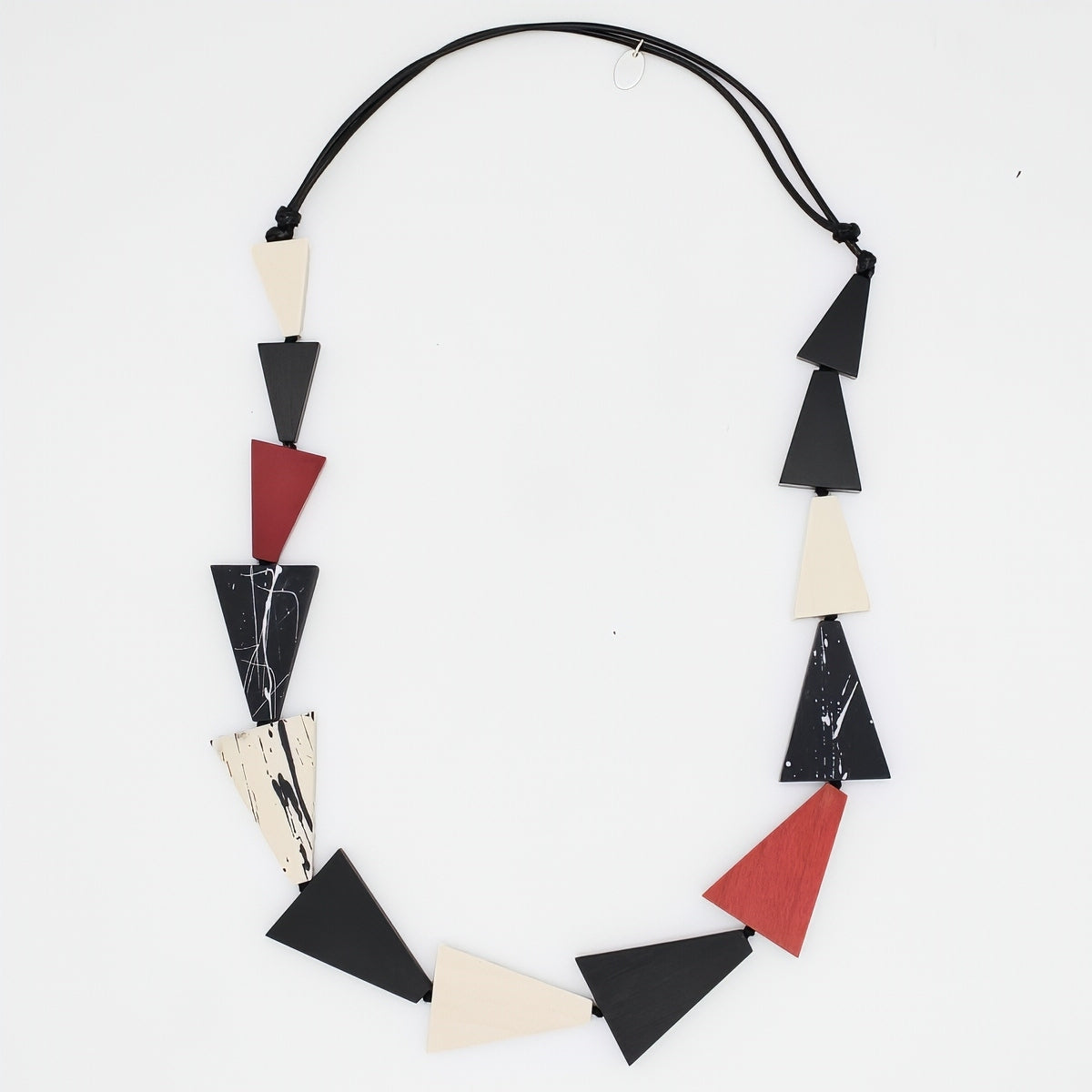 Stand out with the Red and Black Zara Triangle Statement Necklace, crafted from wood with a unique black, ivory splatter, and red design. Its bold triangular shapes create a modern, artistic look that adds edge and sophistication to any outfit. Lightweight yet eye-catching, this necklace is perfect for expressing your individual style with confidence.
