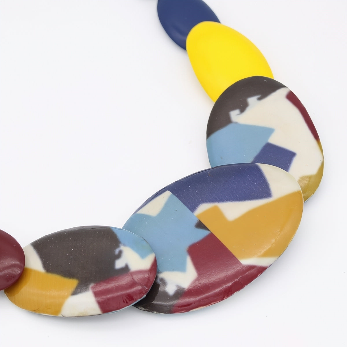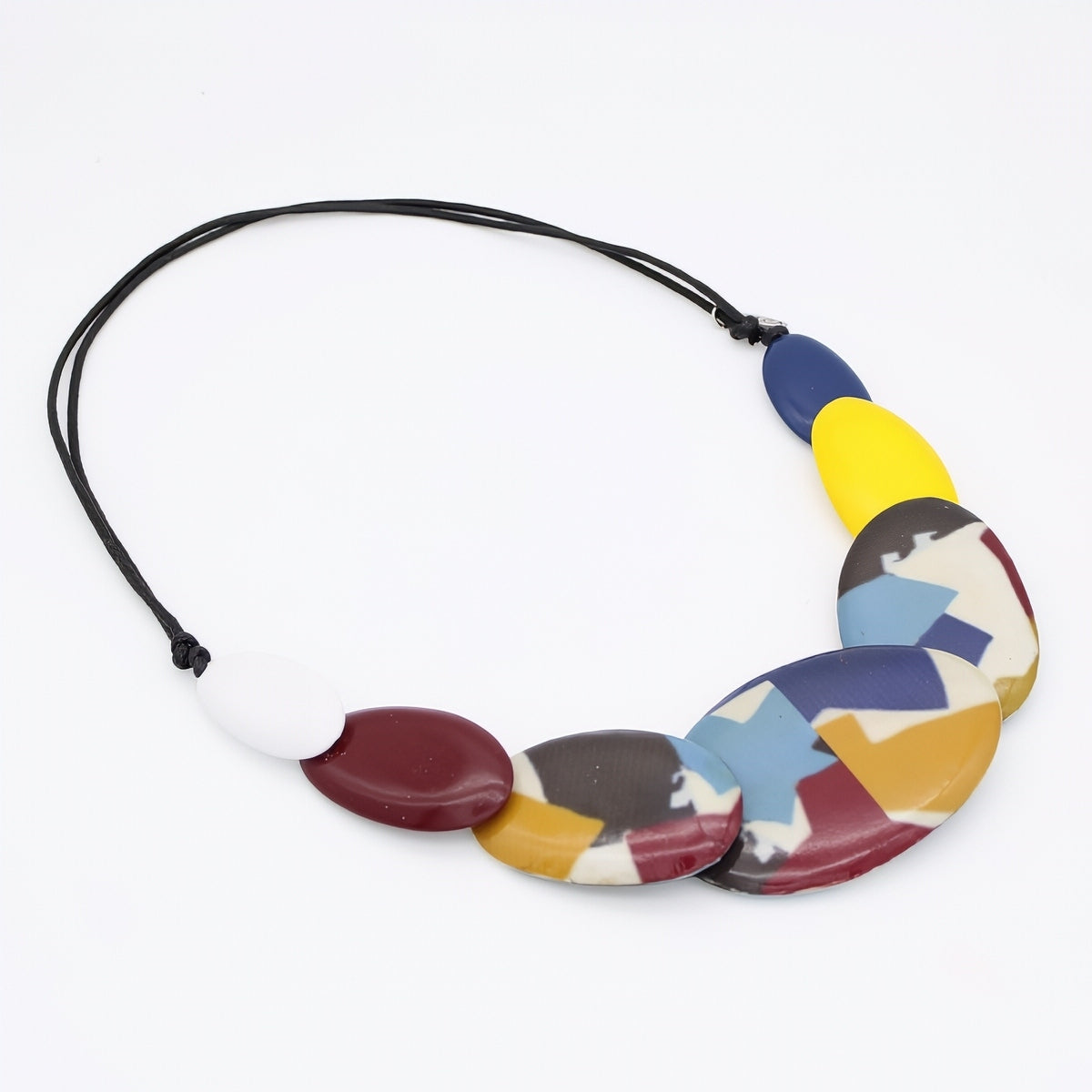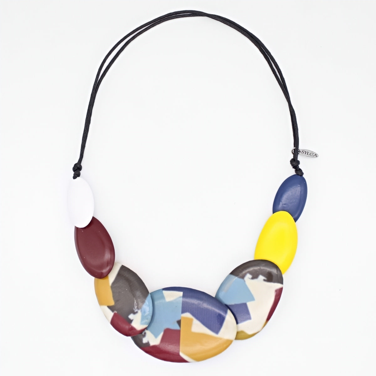 This cleverly crafted statement necklace was made to enhance your neckline. Hand painted wood beads are layered together in vibrant yellow, blue, and red colors and features decoupage overlay for added dimension. Hung from an adjustable black wax cord, you chose the length you prefer. Wear this necklace over a solid shirt or dress for a look sure to standout.