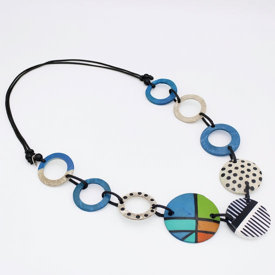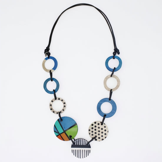 Bring playful energy to your neckline with this Blue Bree Link statement piece featuring hand-painted blue, white and orange shell discs adorned with whimsical geometric and polka dot details. Strung on a soft, adjustable black wax cord, it's designed for mixing, matching, and making a mood. Each accent bead is individually painted, ensuring your necklace is as unique as your style.