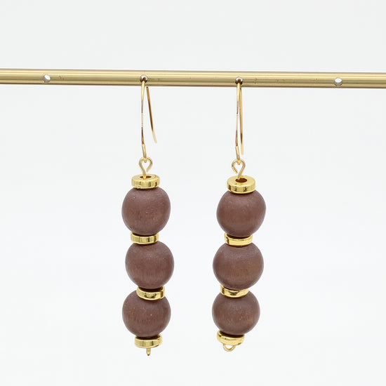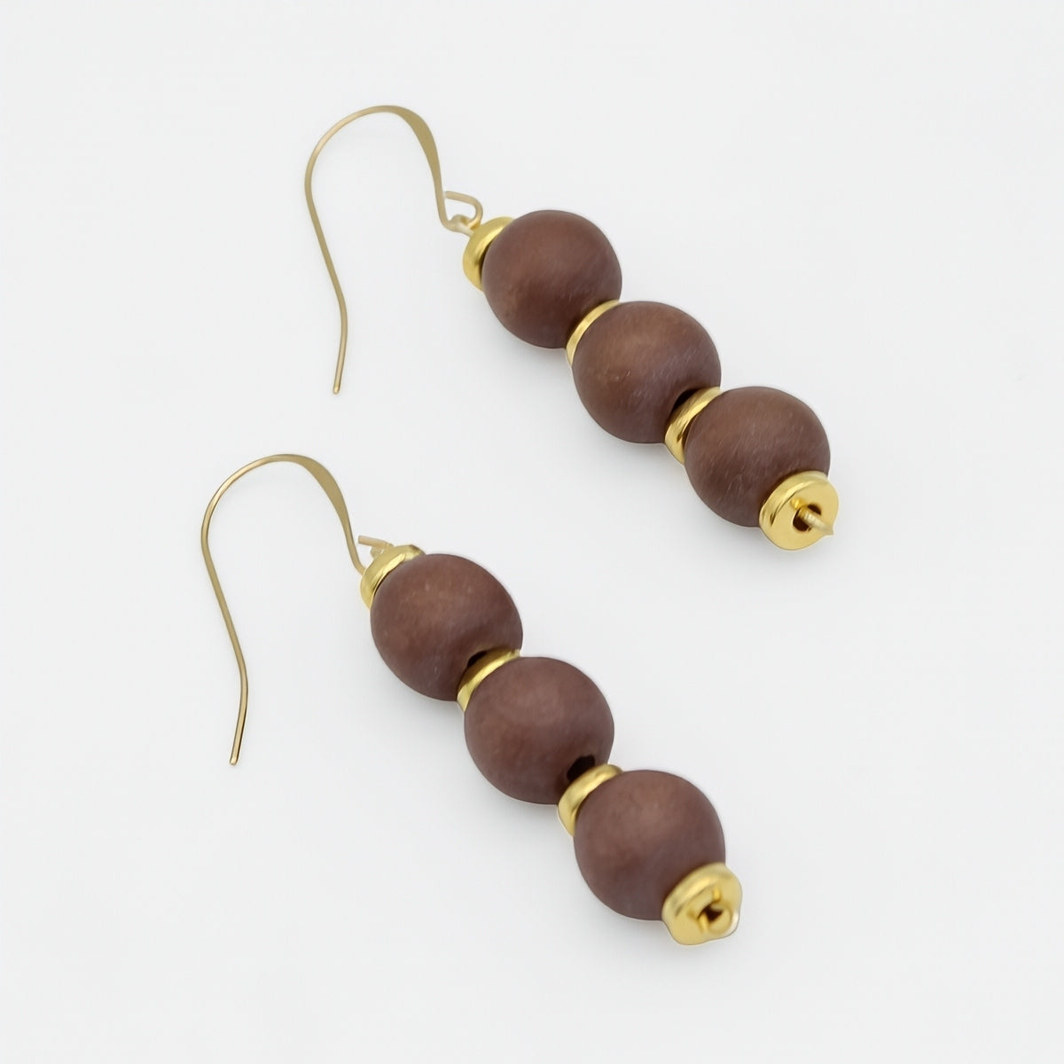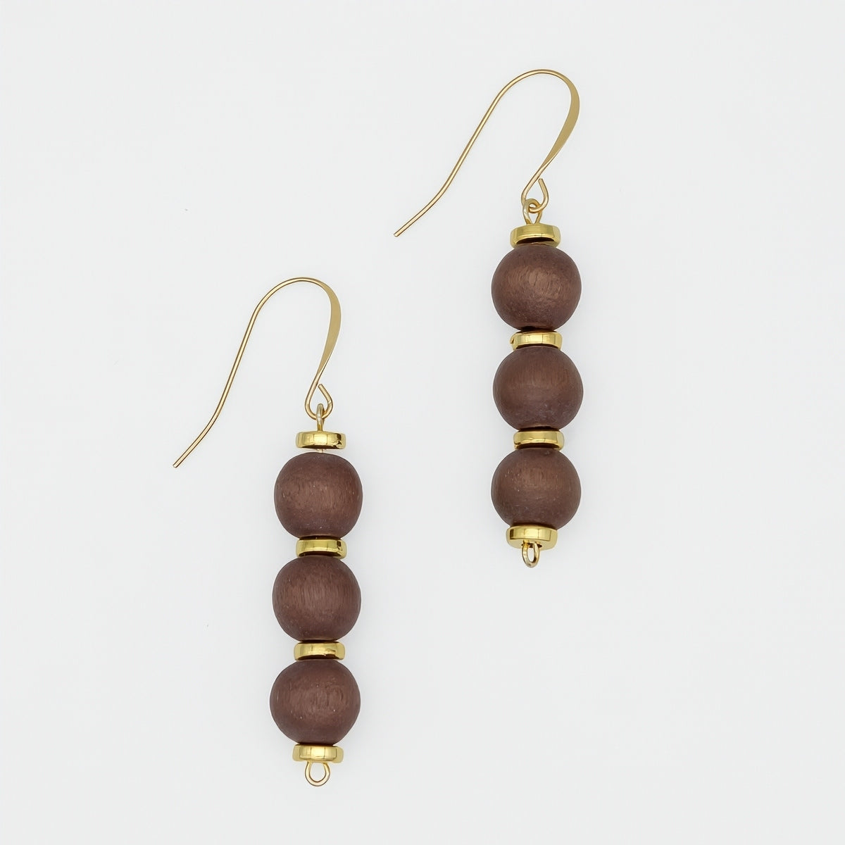 - Materials: Wood beads, gold-plated French hooks