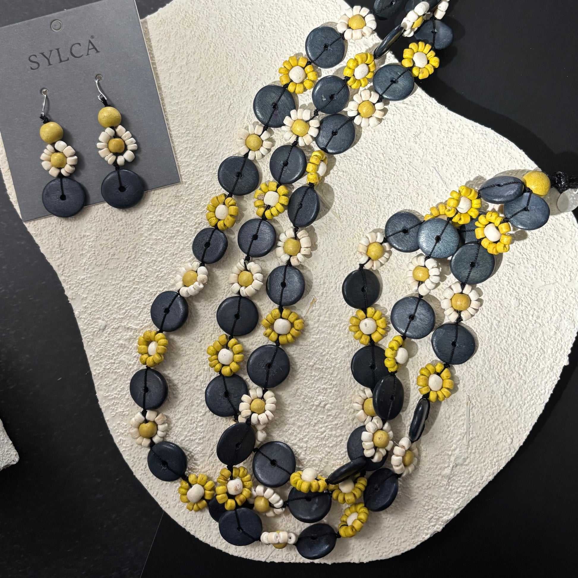 This playful triple strand necklace features hand-strung mini daisies in vibrant chartreuse, cream, and black. Lightweight and adjustable, it’s a boho statement piece that adds a cheerful, fresh vibe to any outfit.