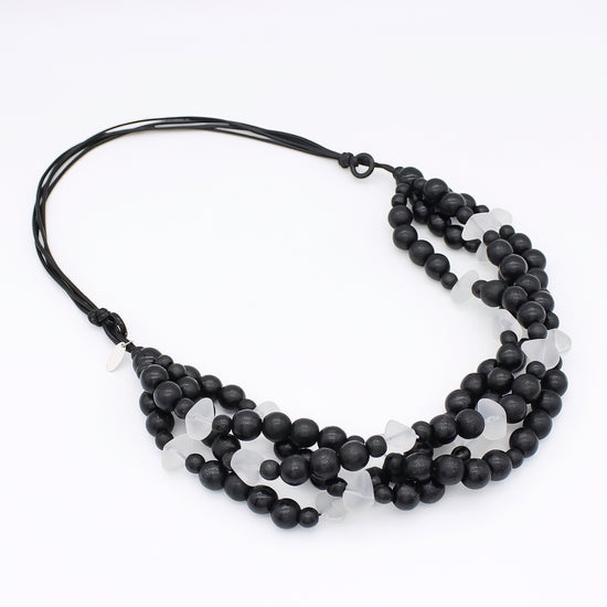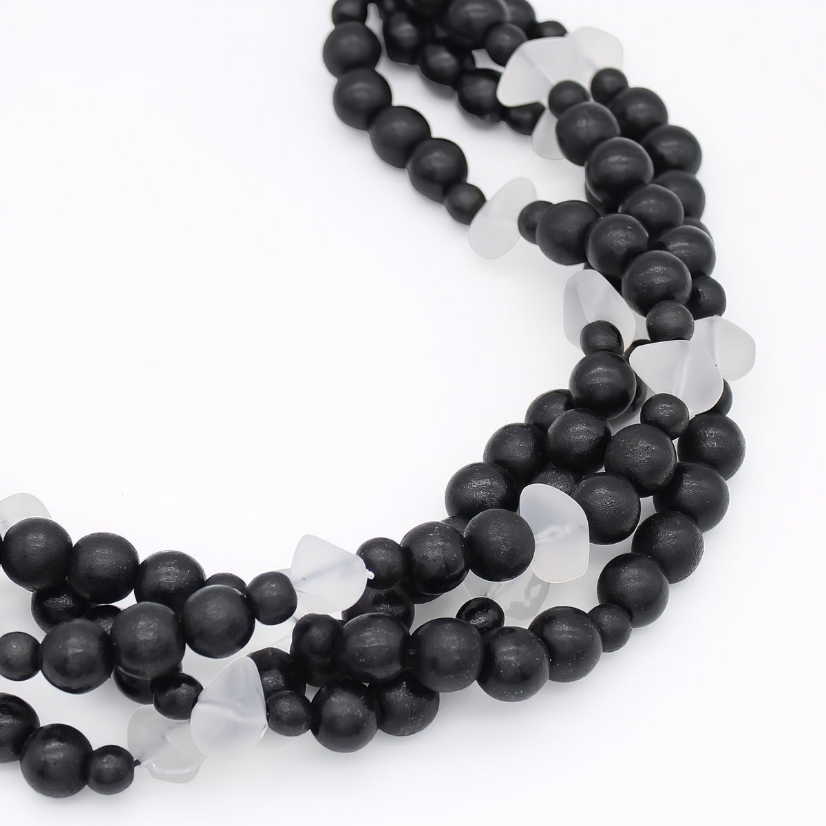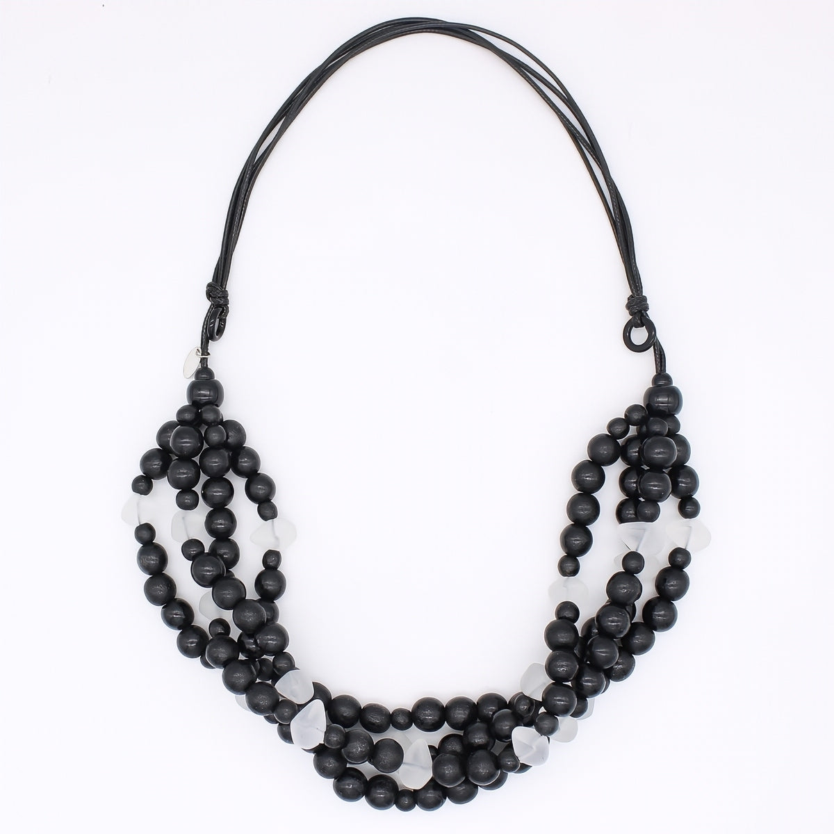 Multiple strands of black wood beads accented with frosted beads create a beautiful necklace that will enhance your neckline. Hung on an adjustable black wax cord, you can wear this necklace short or long you can't go wrong. This lightweight necklace can be worn alone or paired with coordinating earrings.