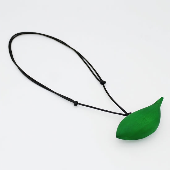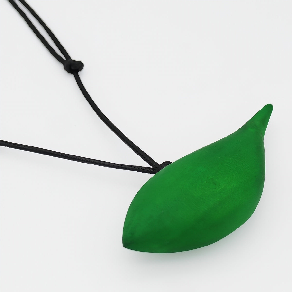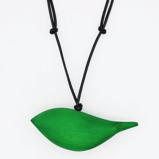This unique handcrafted bird pendant necklace is a must have for your collection. The Emerald Green wooden pendant hangs on an adjustable black wax cord giving you the option to wear at any length you desire. Pair this necklace with a simple outfit or a fun patterned dress!