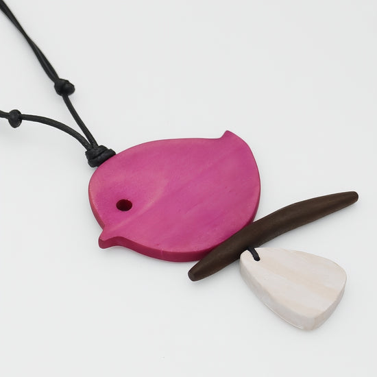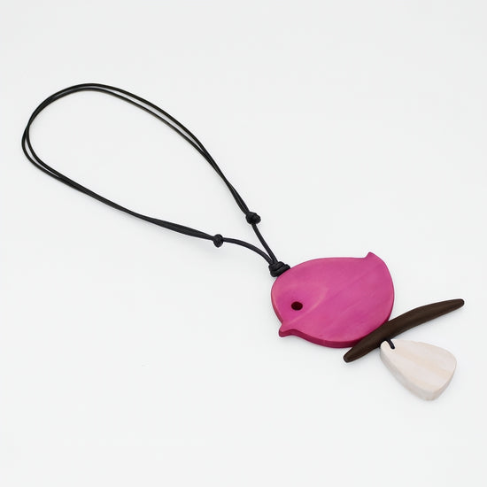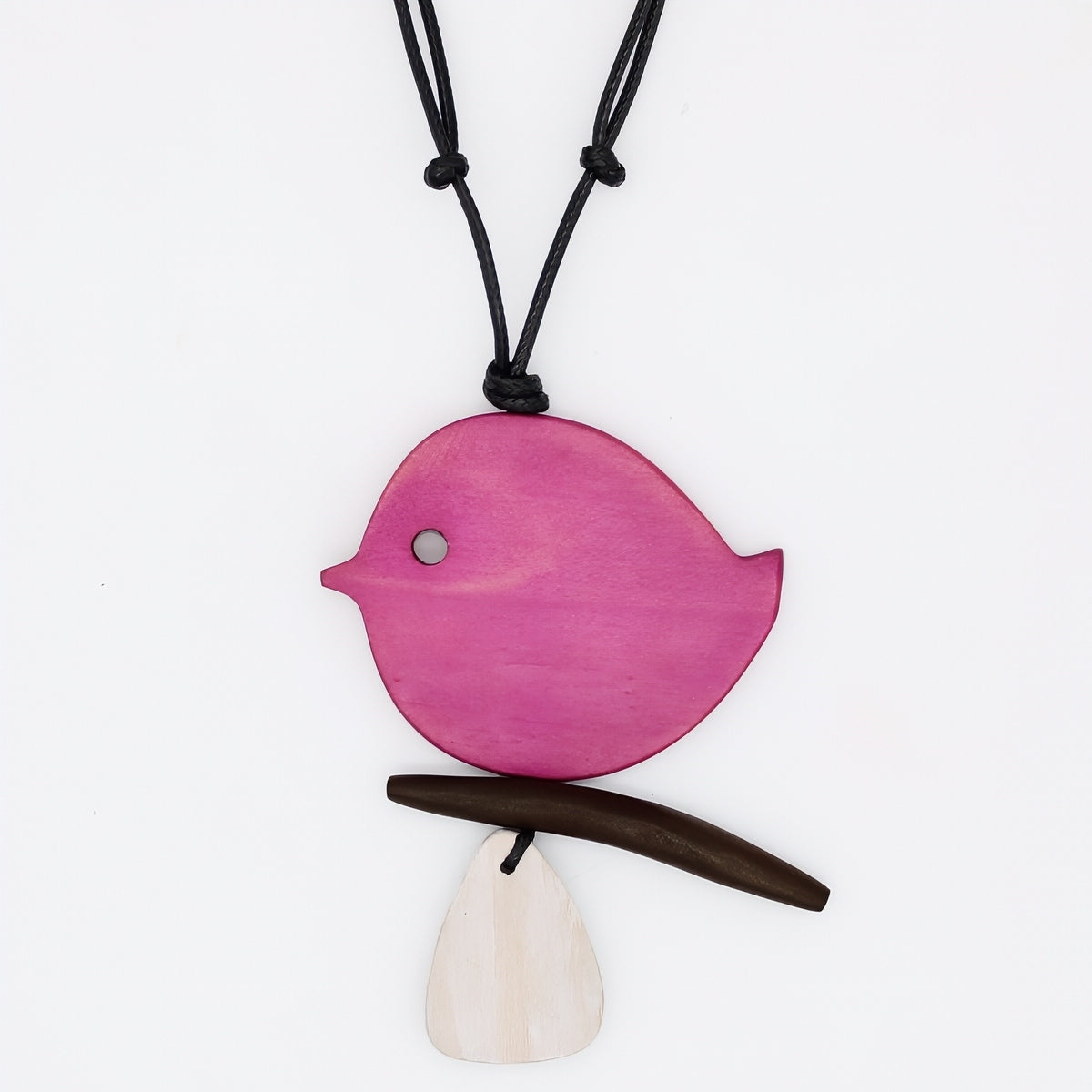 Everyone's favorite robin is back in a vibrant new design! The Fuchsia Robin On A Branch Necklace features a beautifully hand-painted wooden pendant showcasing a cheerful fuchsia robin perched gracefully on a branch. This eye-catching piece brings a pop of color and whimsy to your everyday style.