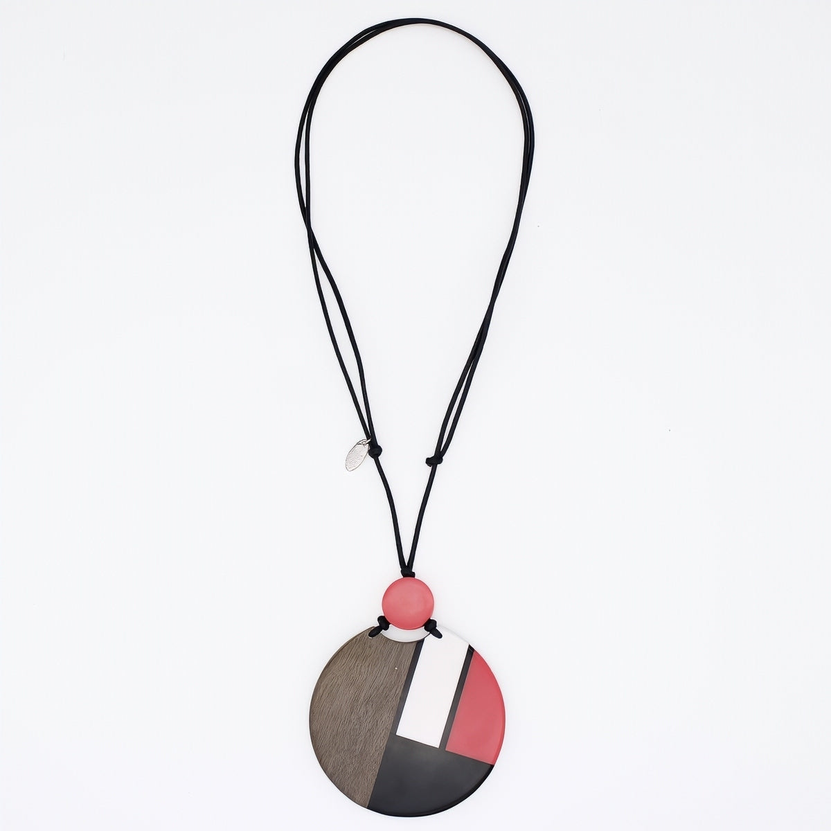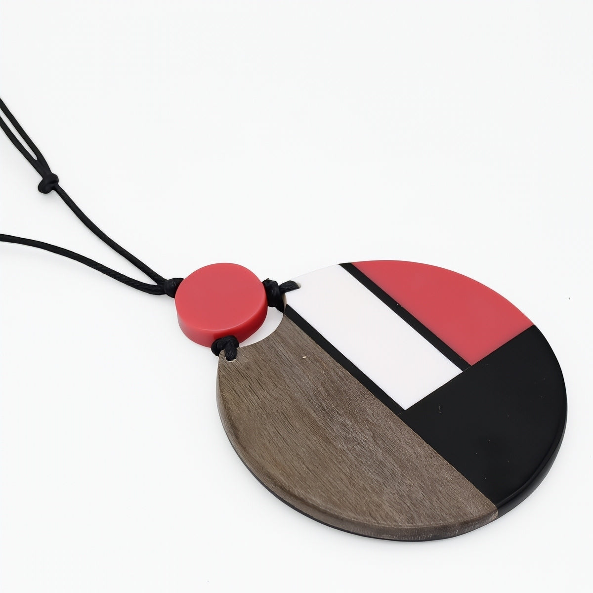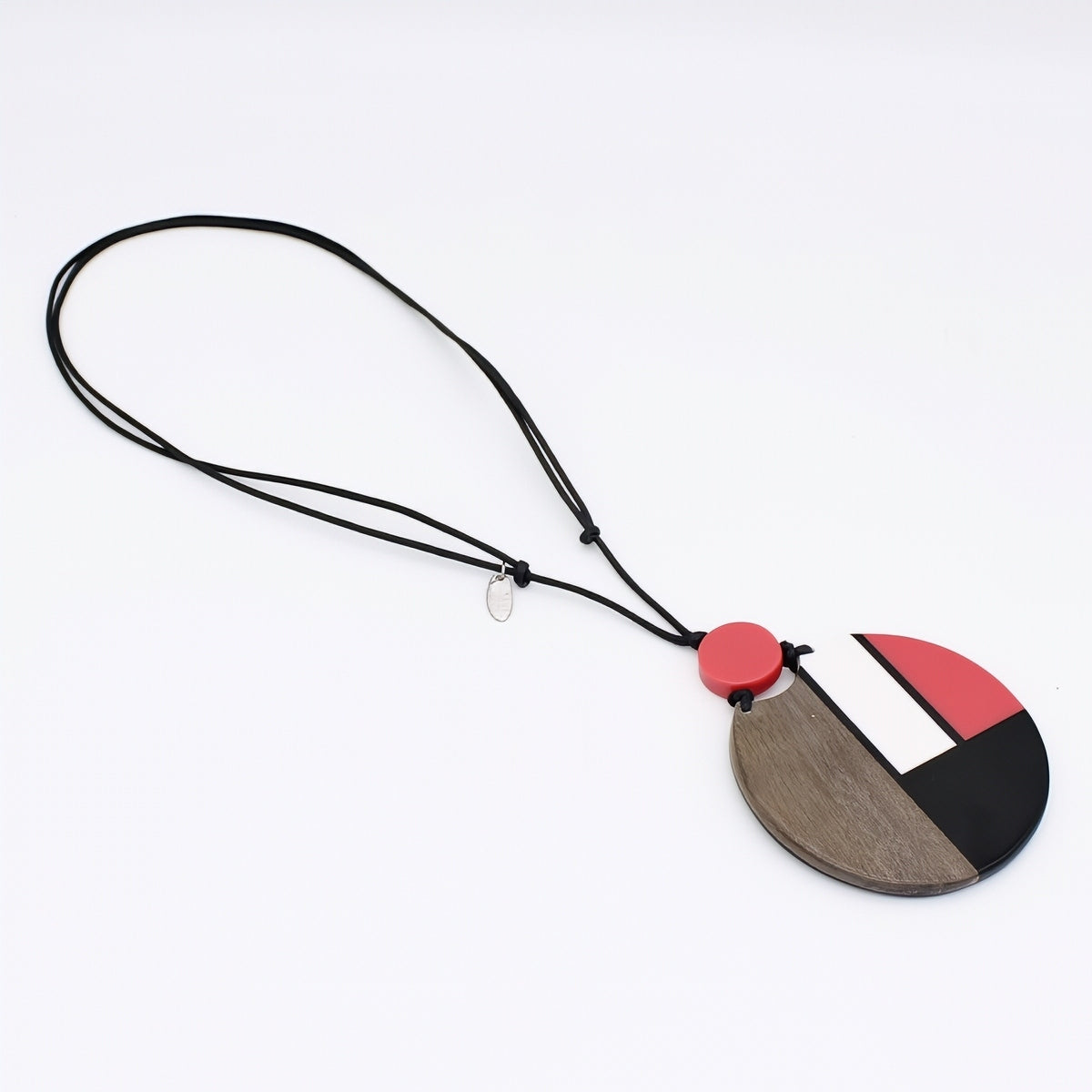 This artesian handcrafted round pendant necklace will be your new go-to necklace. The color block design features a color palette of black, white, and red that will pair well with any outfit. The adjustable black wax cord lets you wear this pendant at any length you choose. Wear alone or with coordinating earrings; either way you can’t go wrong.