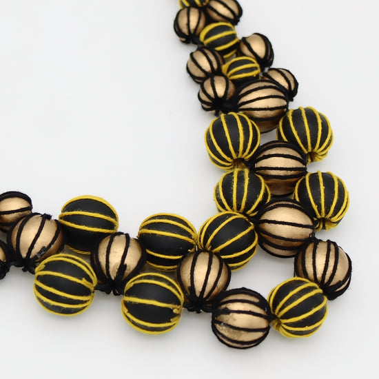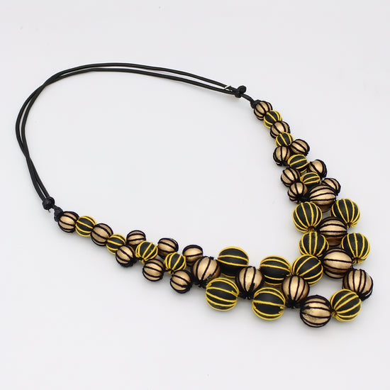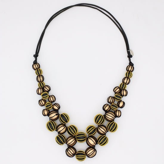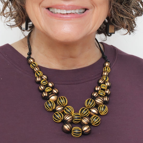 Adorn yourself with the elegance and artistry of the Black and Gold Pamela Berries Necklace. This statement necklace features wooden beads, expertly wrapped and closely knotted for a luxurious and exclusive look. A popular addition to any wardrobe, this lightweight and adjustable necklace is sure to make a statement and elevate any outfit.