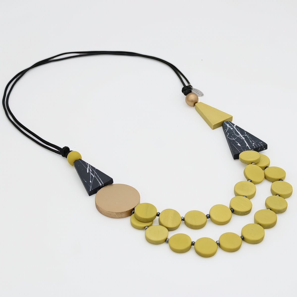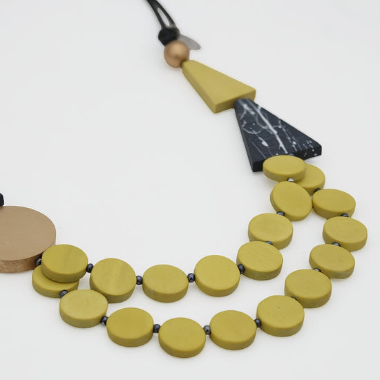 Make a dramatic impression with Scarlett, a captivating yellow and gold multi-strand necklace that combines bold geometric elements with layered sophistication. This contemporary art jewelry piece features an artistic blend of circular and angular shapes for the confident woman who loves to make a statement.