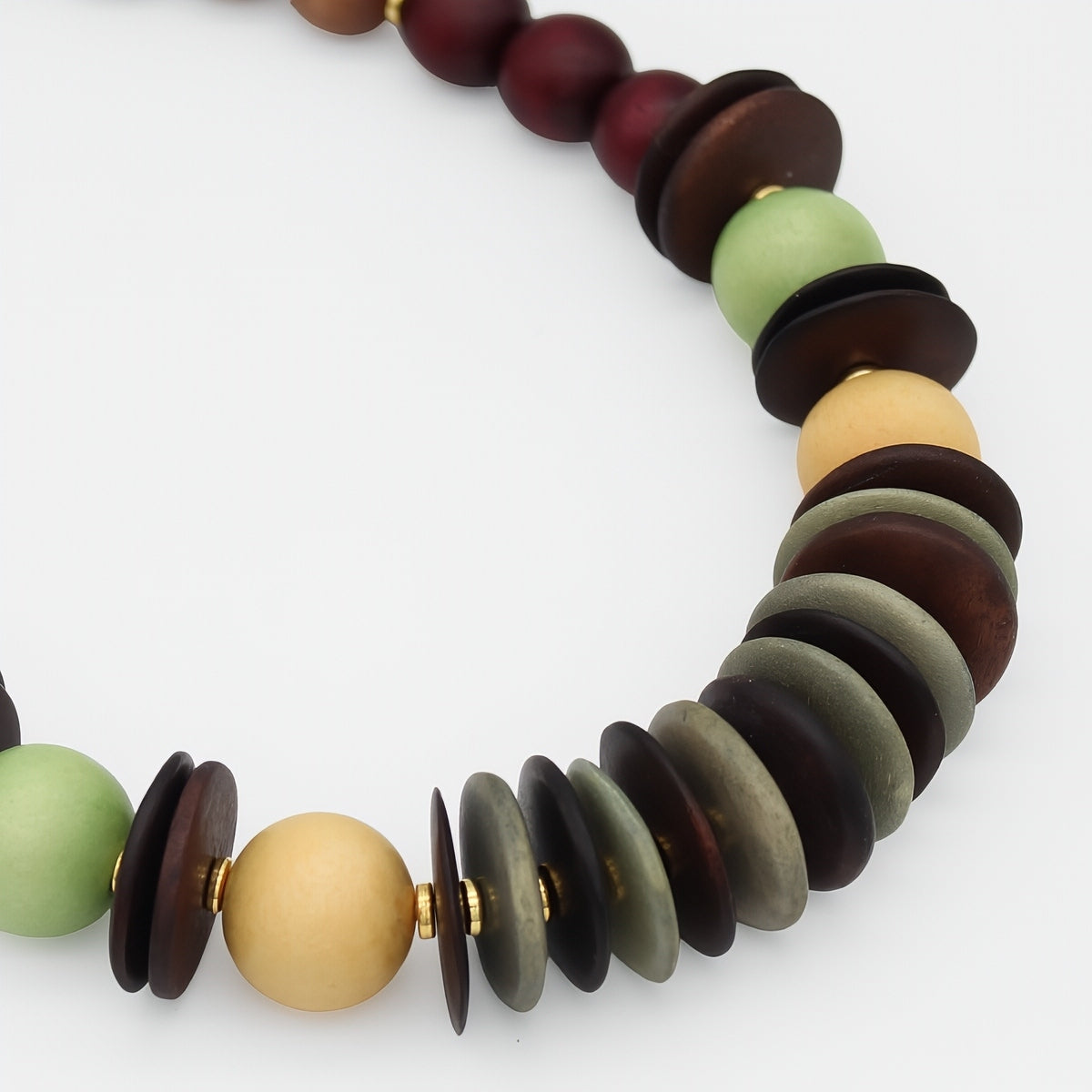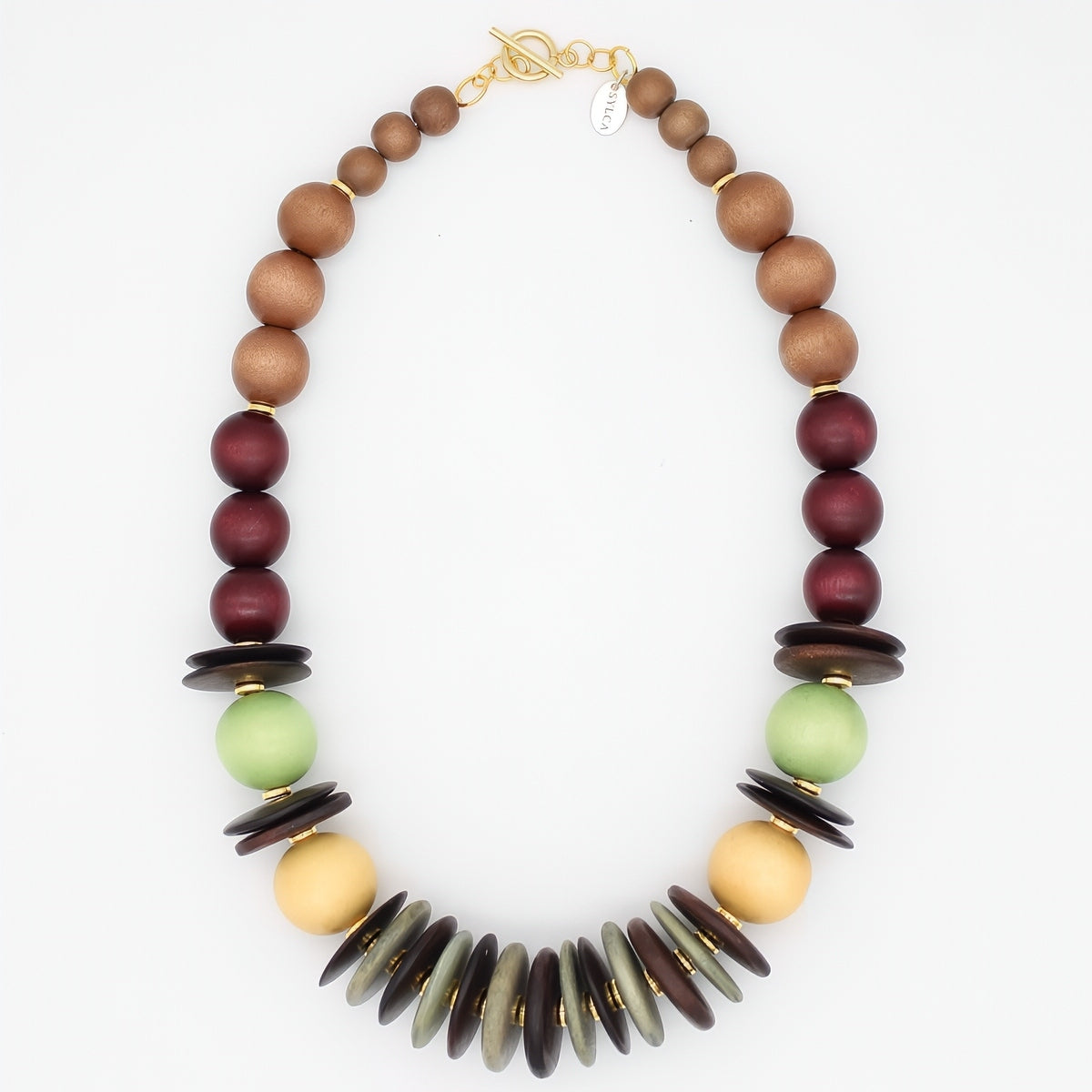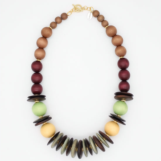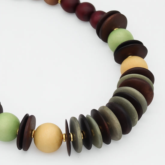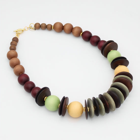 - Handcrafted wood beads in a rich, multi-toned color palette that complements any wardrobe