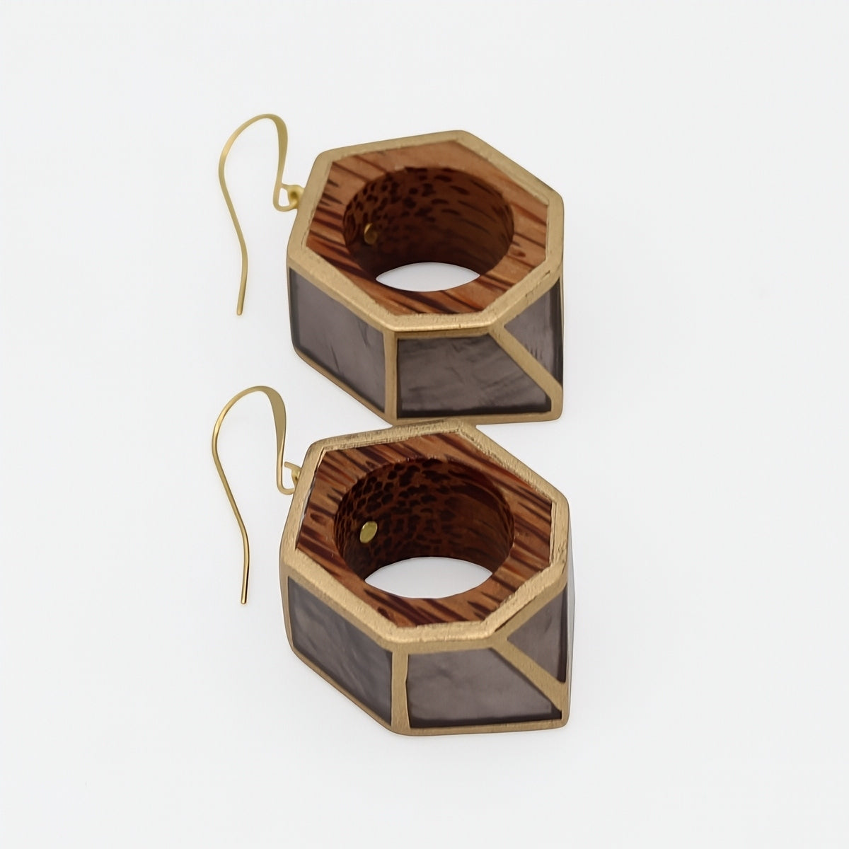 These striking hexagon earrings blend contemporary design with organic materials, creating a statement piece that feels both bold and effortless. Crafted with natural wood and gray resin accents, each pair celebrates the beauty of contrast—smooth resin against warm wood grain, sharp angles softened by lightweight comfort.