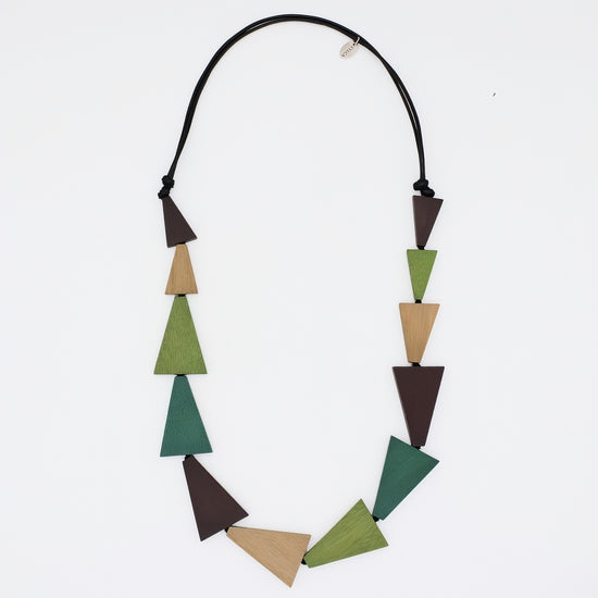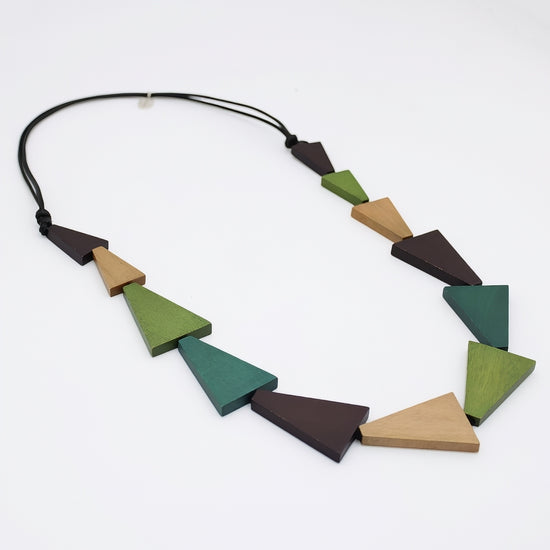 Stand out with the Green Zara Triangle Statement Necklace, crafted from wood with shades of greens and brown. Its bold triangular shapes create a modern, artistic look that adds edge and sophistication to any outfit. Lightweight yet eye-catching, this necklace is perfect for expressing your individual style with confidence.