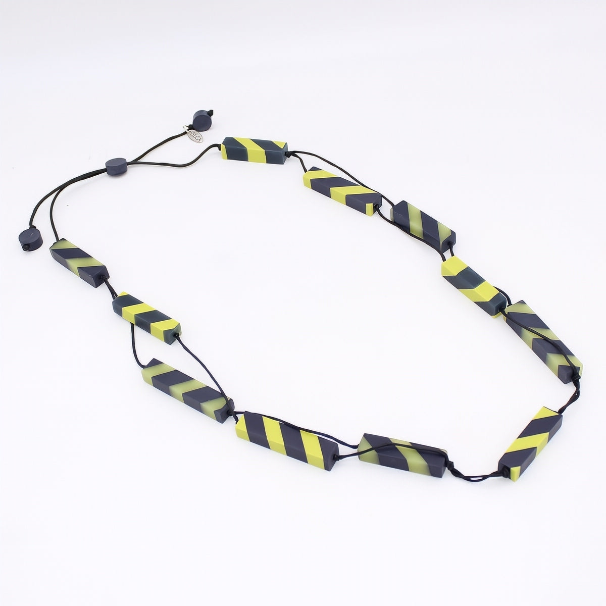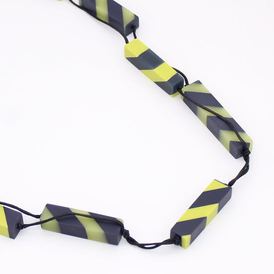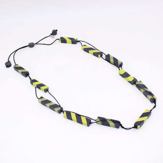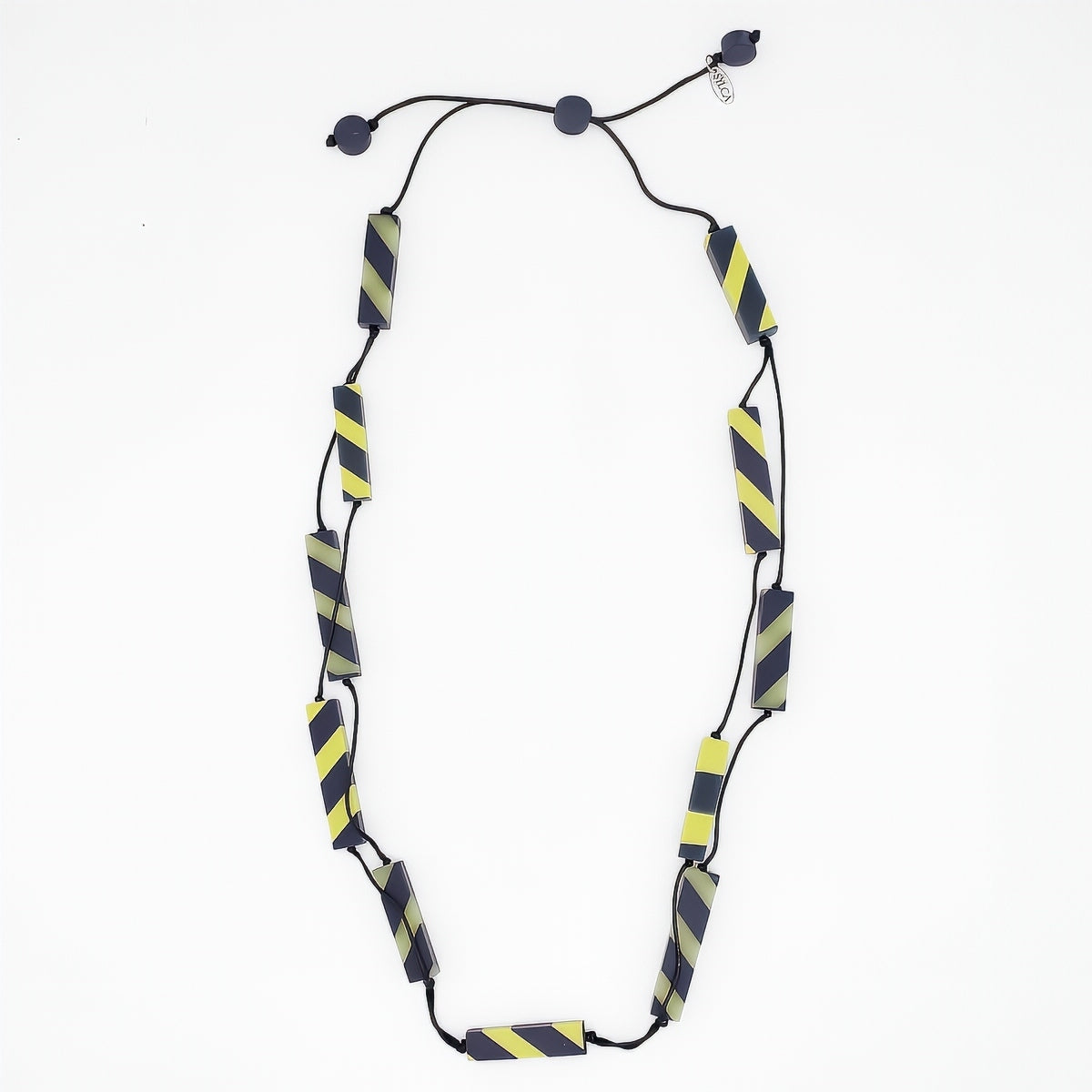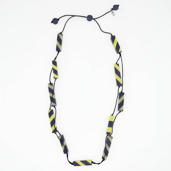 Lightweight, fun, and easy to wear; but the color combination, is what makes this necklace stand out! Rectangle lime resin beads with a navy blue design hang sporadically on a black wax cord. The necklace is adjustable so you get to choose the length you prefer! Pair with a simple jeans and tee for an effortless.