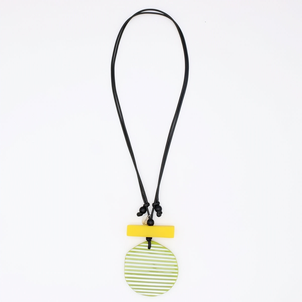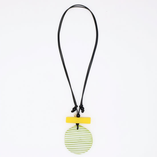 Bring a pop of color to your everyday look with this cheerful Lime Palms Statement Pendant. Crafted from lightweight resin, it features bold lime and white stripes wrapped around a smooth round disk, anchored by a striking vertical yellow accent. The adjustable wax cord lets you customize the length to suit your style—wear it short and sweet or long and layered. Perfect for adding a tropical vibe to any outfit.