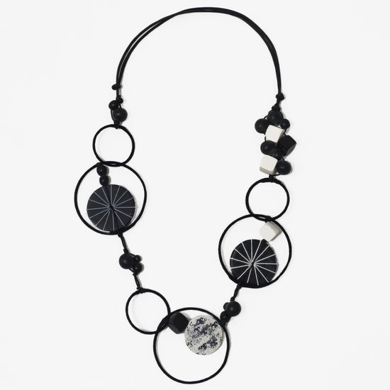 Monochromatic Hayden Disk Necklace – A stunning statement piece that effortlessly elevates any look. This artfully crafted necklace features round metal loops wrapped in luxurious thread, beautifully accented with black and off white wood disks and cube beads throughout. Hung on an adjustable black wax cord, you have complete control over your perfect length.