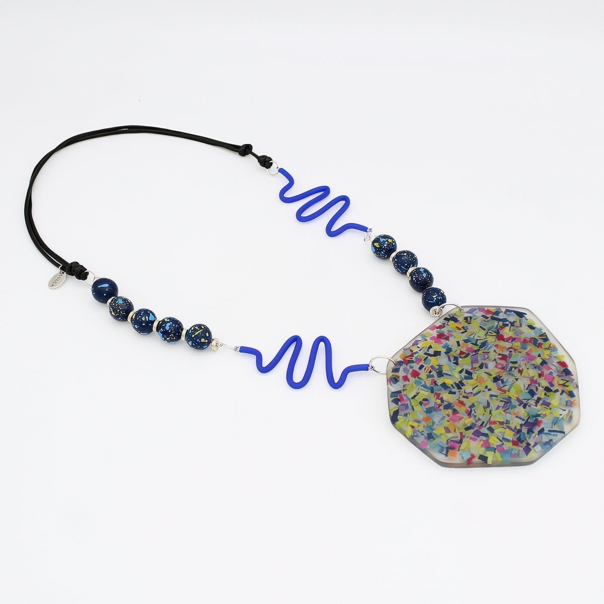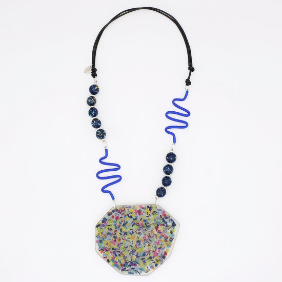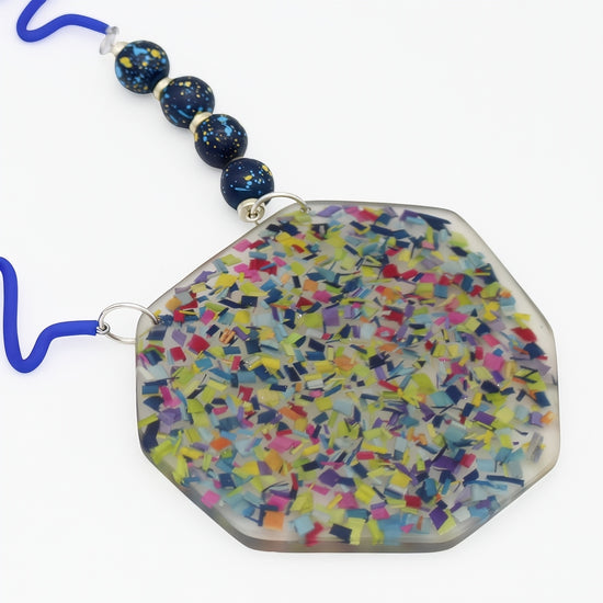 A colorful addition to any outfit! Hand crafted in house, this necklace features a large frosted confetti resin bead strung along side rubber tubing and round beads, finished with a stainless steel paper clip chain. The toggle closure makes it easy to take on and off. Wear over a casual tee and jeans paired with coordinating earrings.