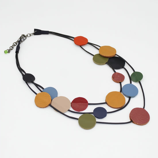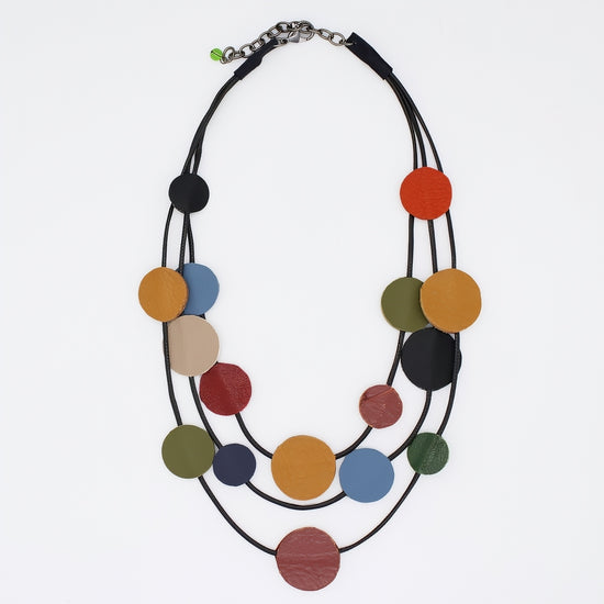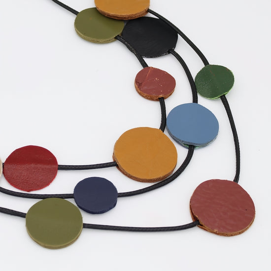The Multi-Color Waverly Leather Statement Necklace showcases triple strands of finely crafted leather circles in blue, mustard, green and tan hues. Skillfully designed to be lightweight and adjustable with a wax cord, it ensures both comfort and a perfect fit. This elegant piece adds a refined touch of color and texture to any sophisticated wardrobe.