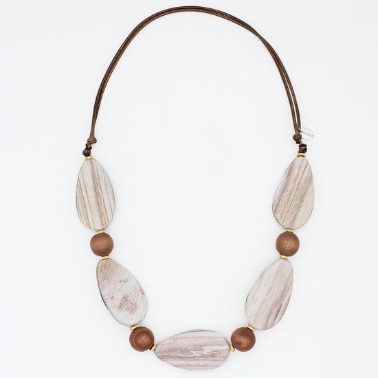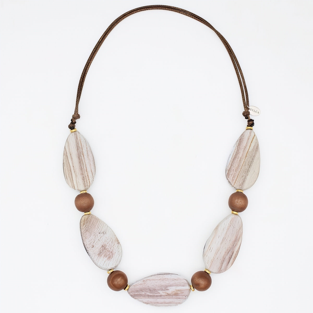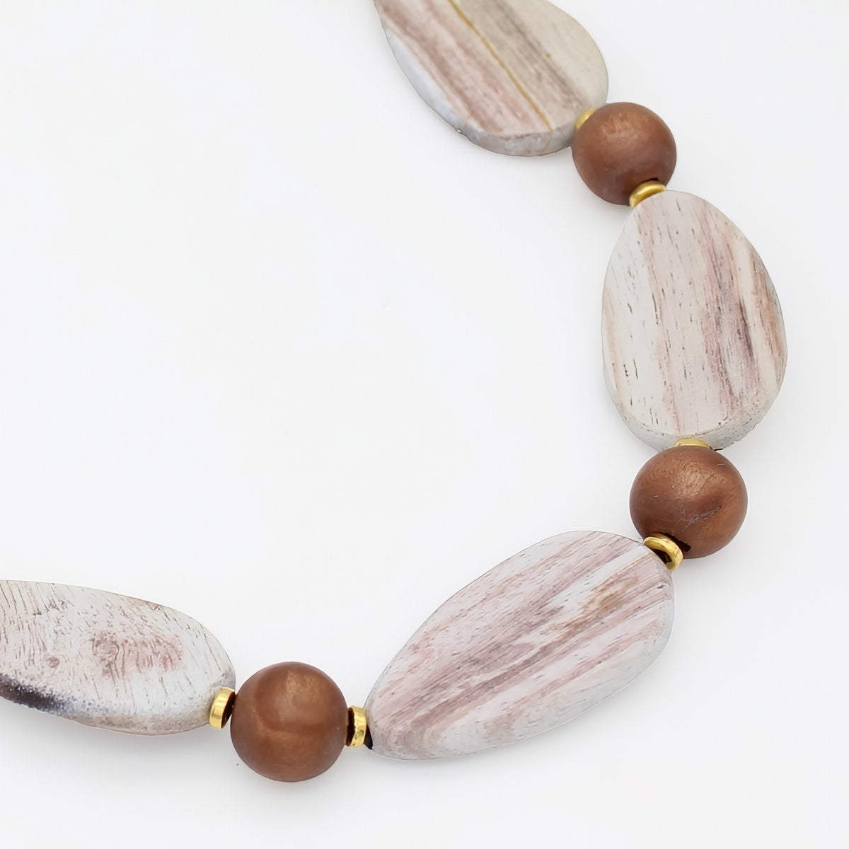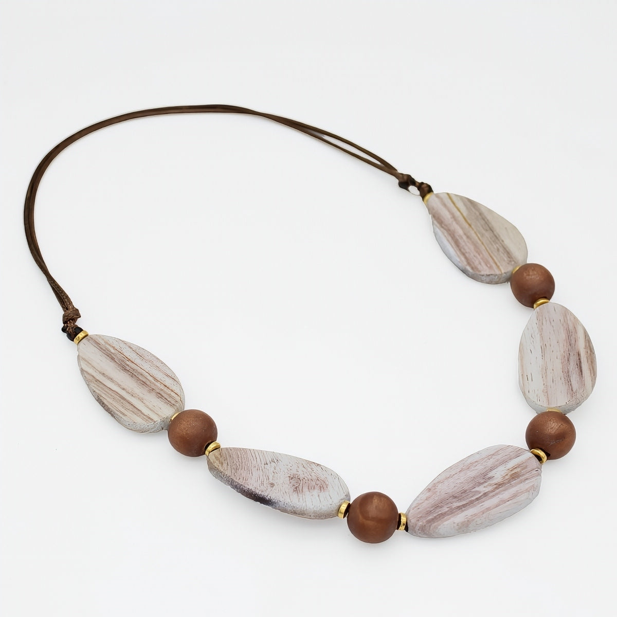 Natural Driftwood Statement Necklace – where raw, organic beauty meets effortless sophistication. This handcrafted piece features smooth wood beads in natural hues strung on an adjustable brown wax cord, creating a statement necklace that's both grounded and refined.