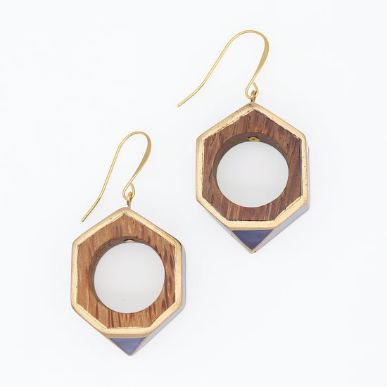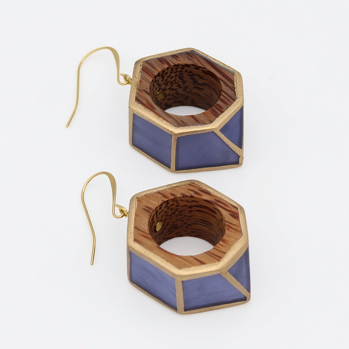 These striking hexagon earrings blend contemporary design with organic materials, creating a statement piece that feels both bold and effortless. Crafted with natural wood and periwinkle resin accents, each pair celebrates the beauty of contrast—smooth resin against warm wood grain, sharp angles softened by lightweight comfort.