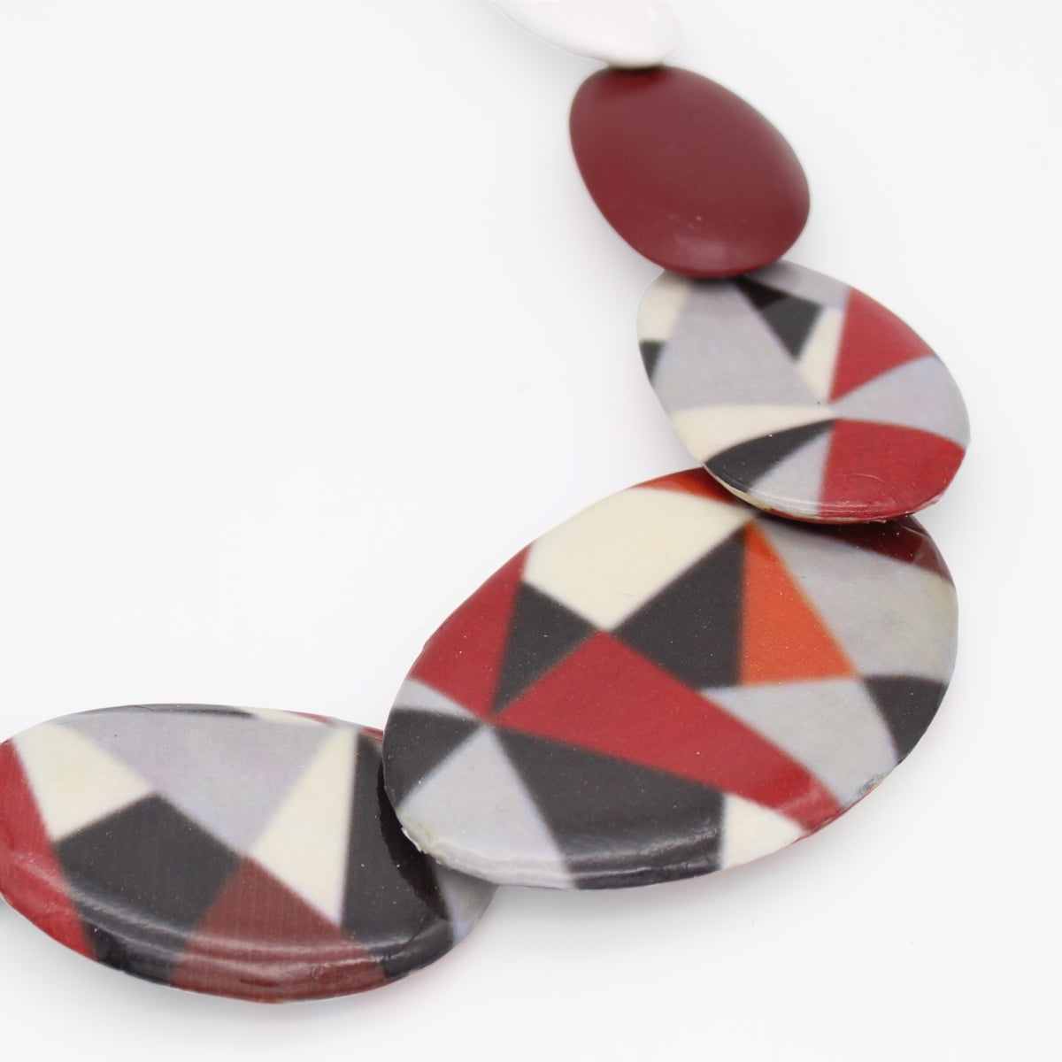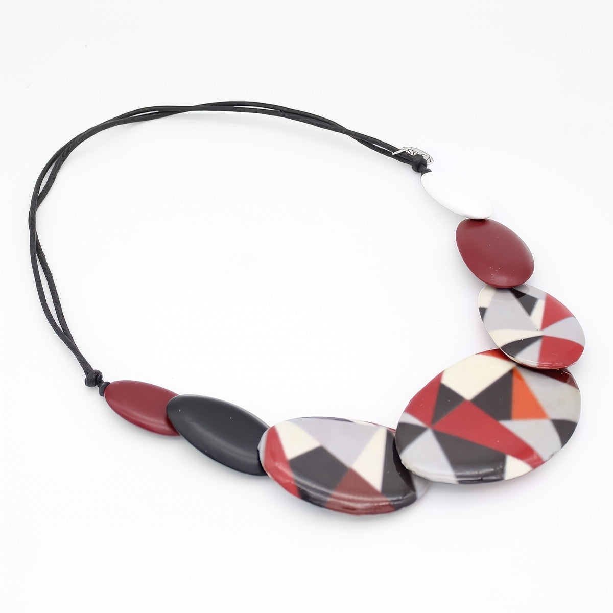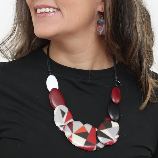 This cleverly crafted statement. necklace was made to enhance your neckline. The focal point of this necklace are the decoupage wrapped beads featuring a red, black, and white geometric design. Hand painted wood beads are layered on either side to finish the necklace. Hung from an adjustable black wax cord, you chose the length you prefer. Wear this necklace over a solid shirt or dress for a look sure to standout.
