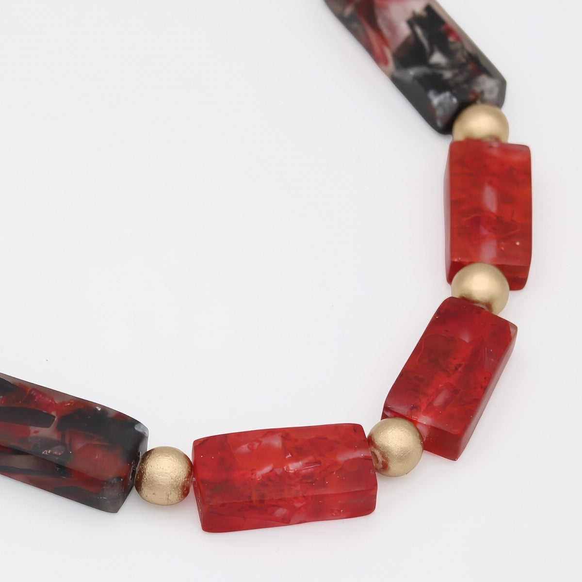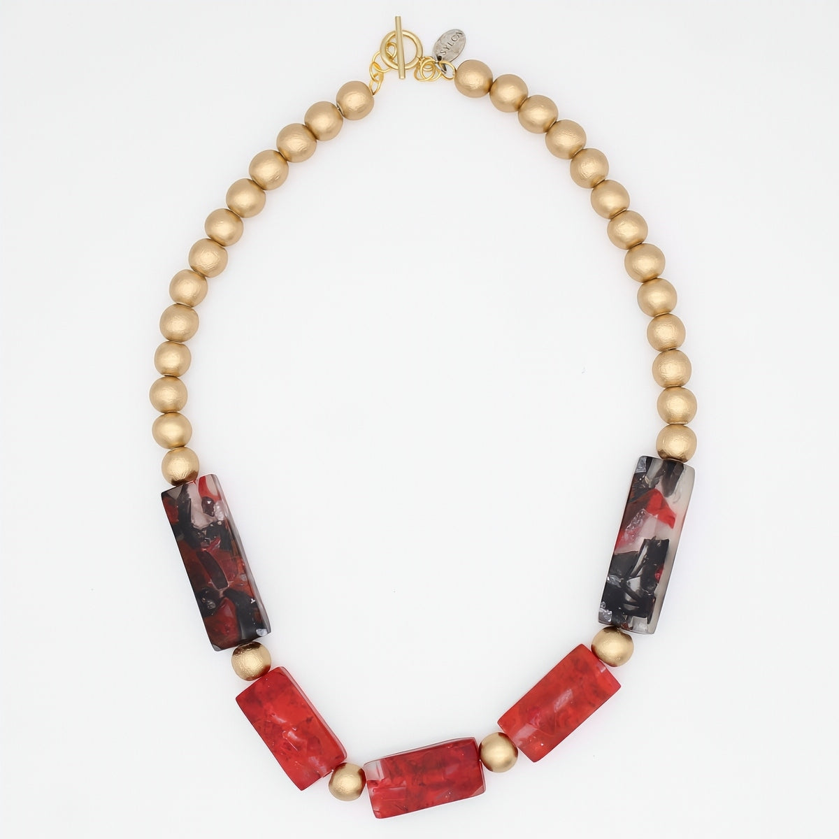 Red Frosted Fusion Necklace — a stunning blend of artful texture and modern design that brings effortless sophistication to any look. This handcrafted statement piece features a striking combination of frosted resin and warm wood elements, creating a beautiful interplay of cool, polished surfaces and organic warmth. Finished with a toggle closure; each bead catches the light in a soft, dimensional way, adding depth and visual interest to this bold yet lightweight design.