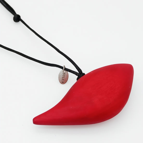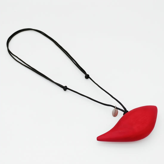 This unique handcrafted bird necklace is a must have for your collection. The red wooden pendant hangs on an adjustable black wax cord giving you the option to wear at any length you desire. Pair this necklace with a simple outfit or a fun patterned dress!