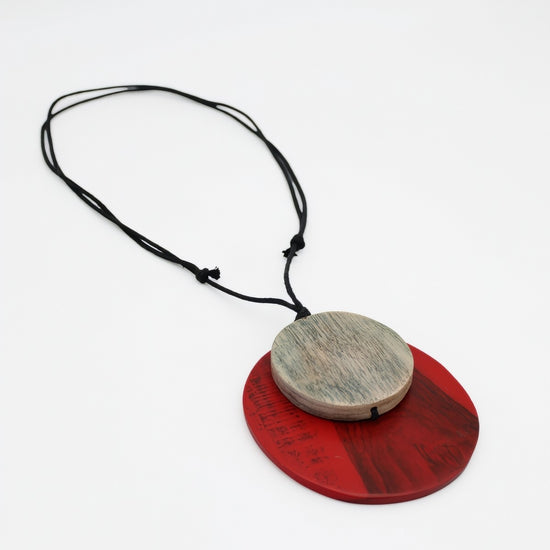 Red Round Double Whitney Pendant is a bold statement piece that brings vibrant energy to any outfit! This handcrafted pendant necklace features a large round red wooden pendant beautifully accented with a small white bead on top, creating a simple yet eye-catching design. Hung from an adjustable black wax cord, you can customize the length to suit your style perfectly.