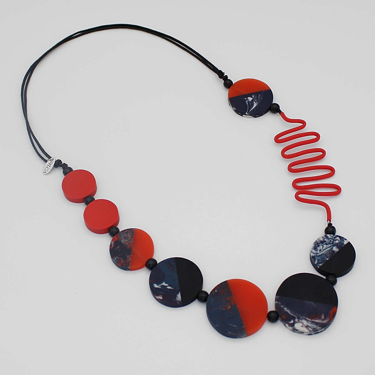 This fashionably repurposed statement necklace has been artfully created with resin beads of marbled blue, white and red along with red tubing and wooden red discs. This lightweight necklace would be the perfect complement to any navy or white pants outfit, dress or t-shirt and jeans. Hung on a 26” to 36” adjustable wax cord for maximum flexibility.
