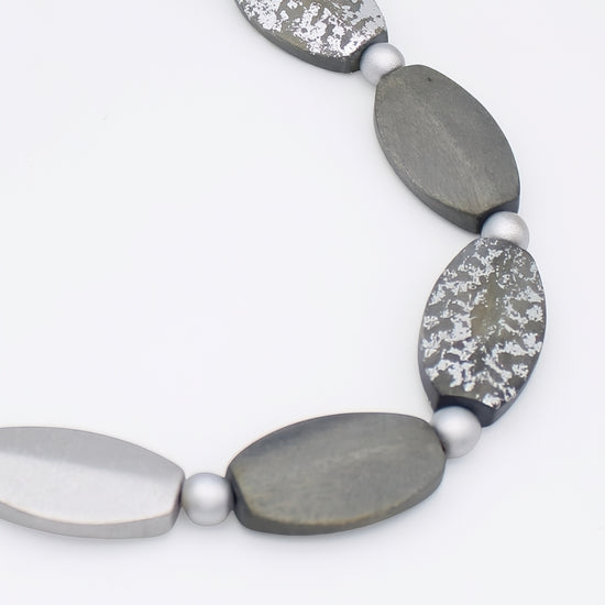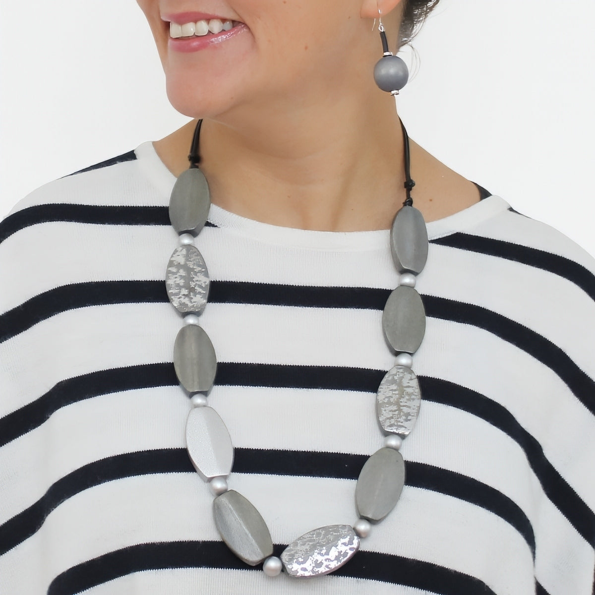 Silver Sloane Inspiro Necklace – Elevate your everyday style with this handcrafted statement piece that seamlessly transitions from day to night. Featuring elongated silver wood beads in alternating shimmery and matte finishes, this artistic necklace showcases thoughtful design and meticulous craftsmanship.