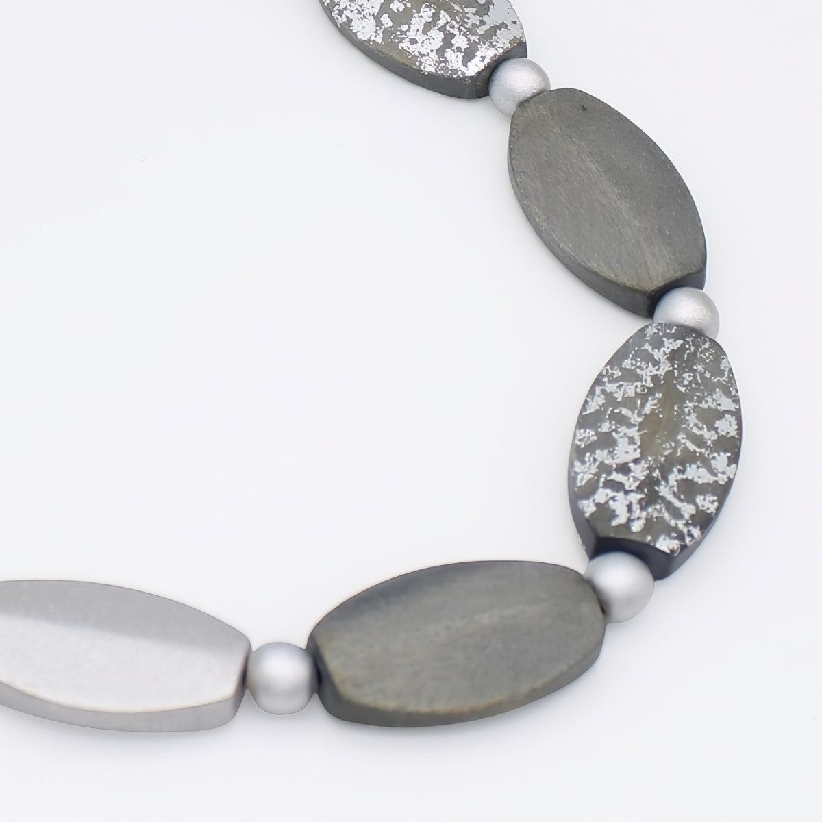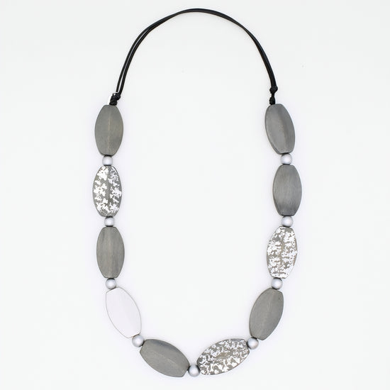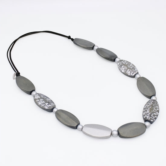 - Materials: Elongated silver wood beads, adjustable wax cord