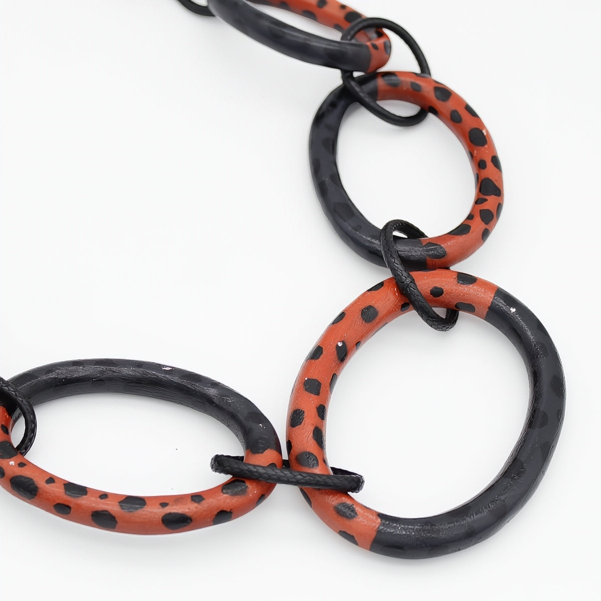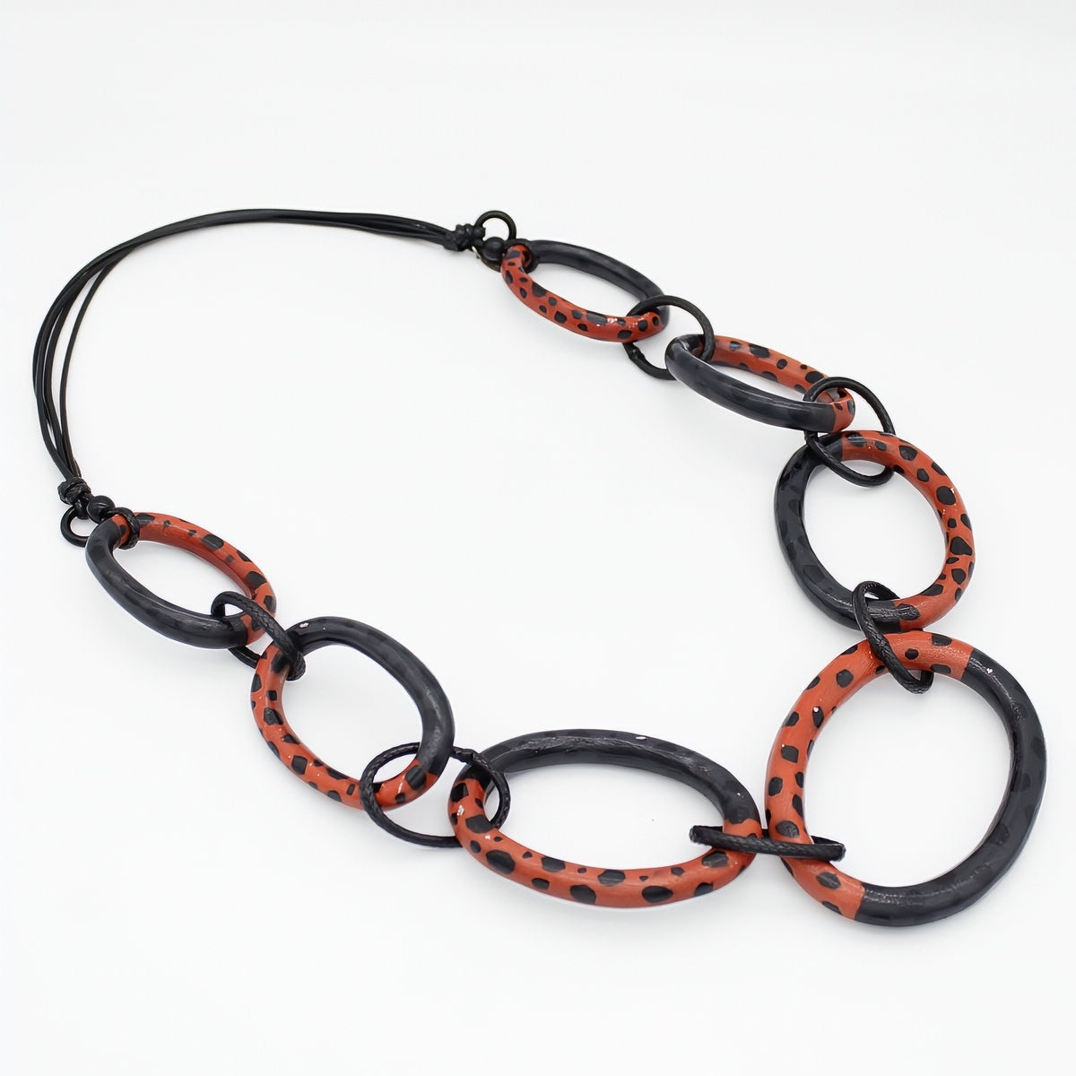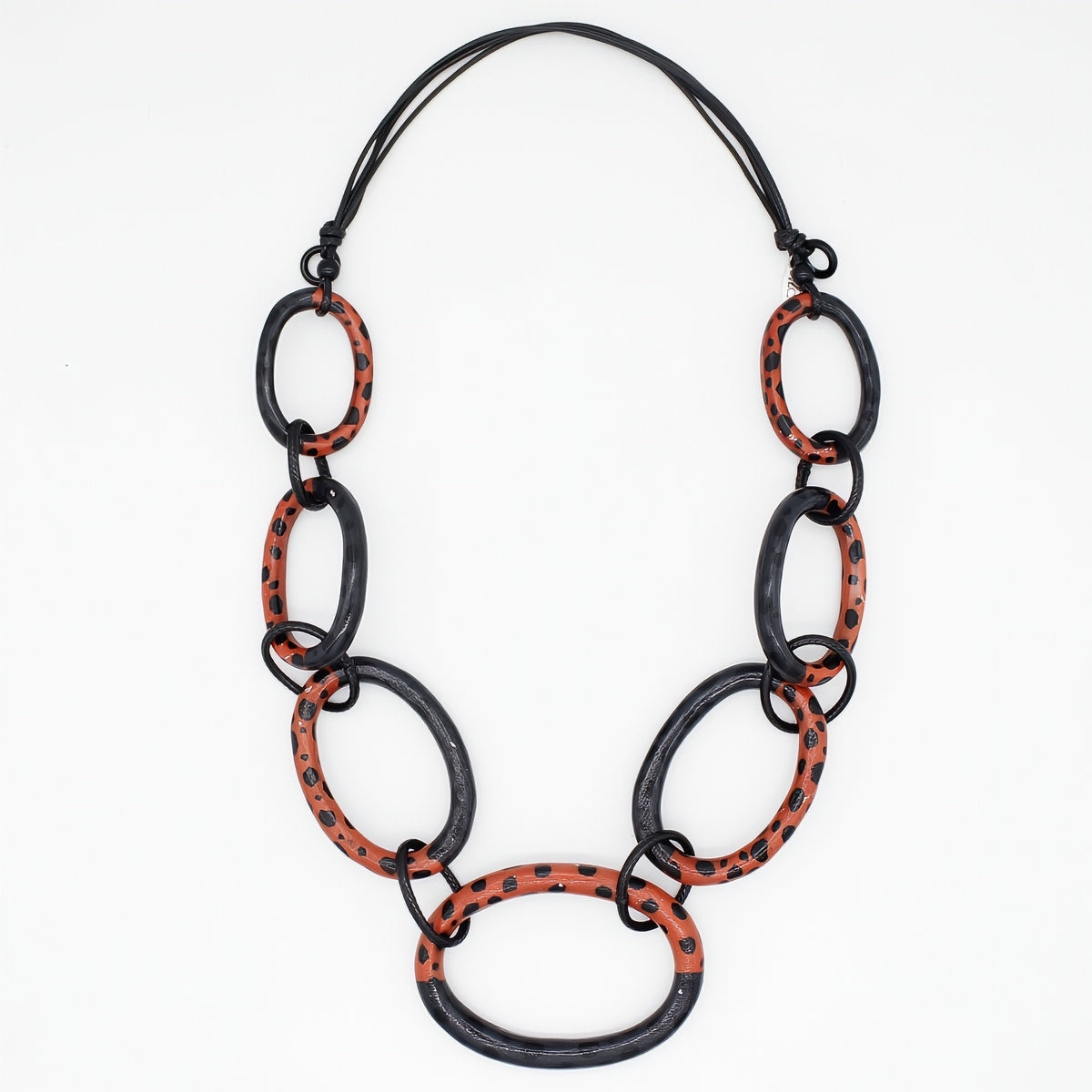 A uniquely artistic necklace created with various sized links in black and sunset orange will create a warm adornment to your outfit. The lightweight links are hand painted with black embellishment and are hung from an adjustable wax cord.