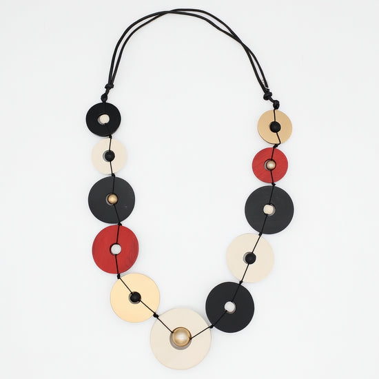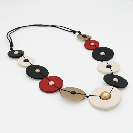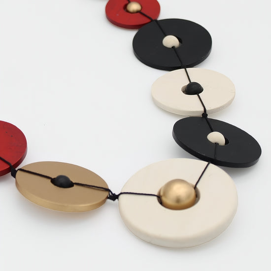 Elevate your style with the Aria Gold Black Red Bold Geometric Statement Necklace. Made from lightweight wood, this striking necklace features a dynamic blend of gold, black, and red circle shapes that command attention. Perfect for adding a vibrant, contemporary touch to any outfit, it’s the ideal accessory to showcase your bold, confident personality.