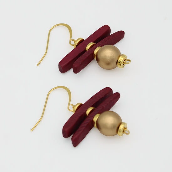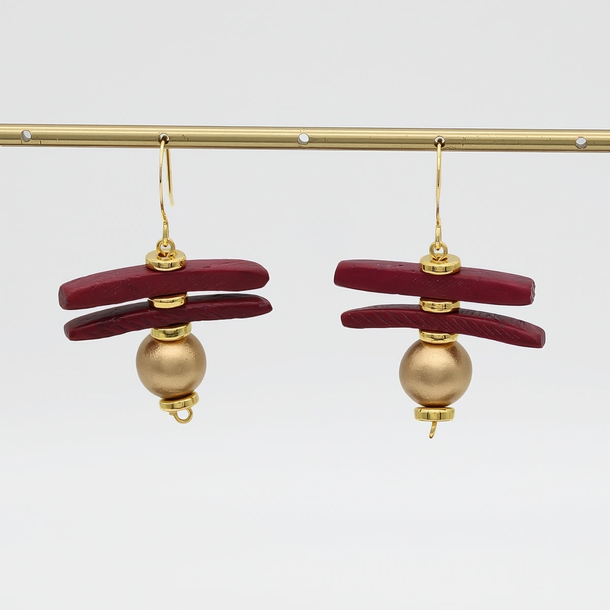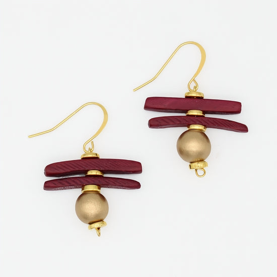 Elevate your style with our Coastal Aura Earrings. Featuring purple and gold wood beads delicately stacked together with gold accents. Hung from a gold plated french hook, these earrings are as lightweight as they are geometric. Complete your look with these captivating and versatile statement pieces.