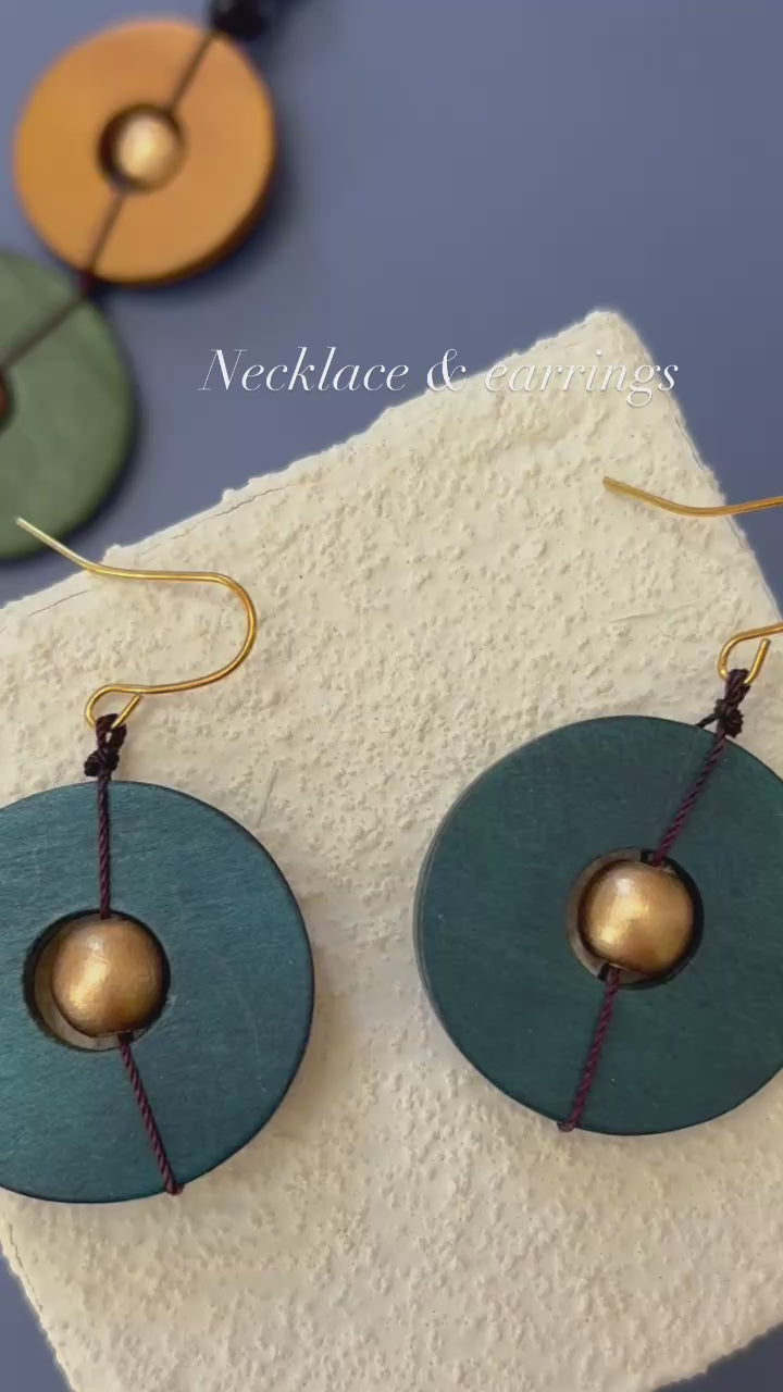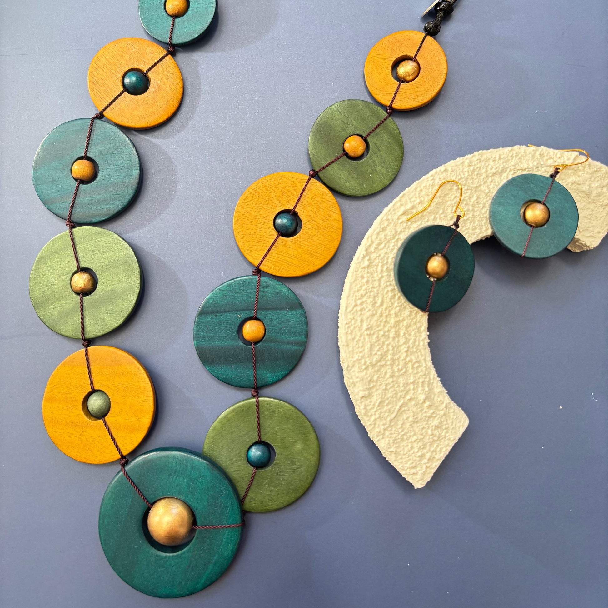 The Teal Wood Unity Necklace showcases a refined blend of teal, olive green, and mustard wooden circles, each featuring a delicate center bead. Hand-strung on an adjustable black wax cord, this lightweight single-strand necklace offers both comfort and elegance, making it a versatile accessory for a sophisticated look.