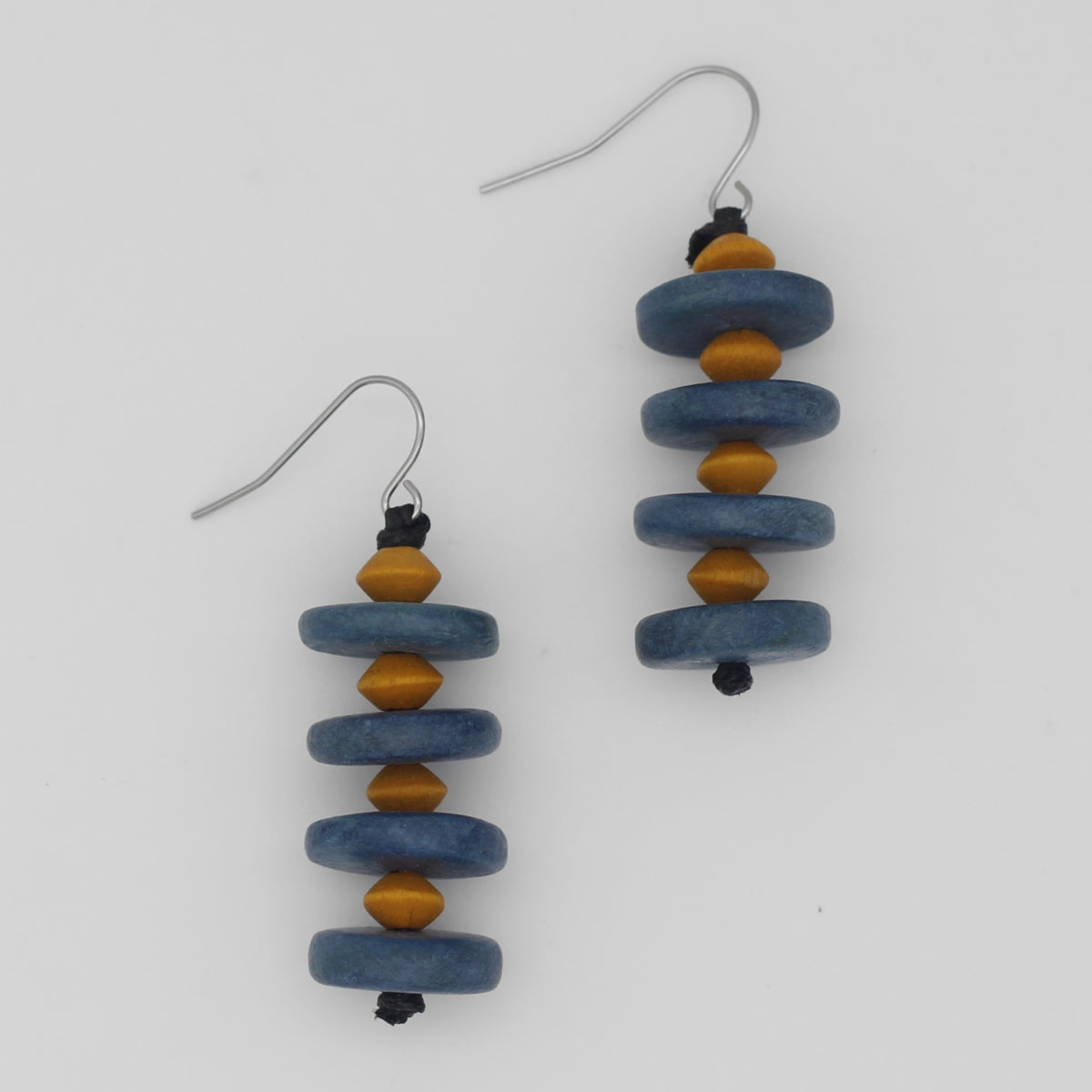 Make a bold statement with these exceptional Blue Tiggy statement earrings. Combining the stunning colors of blue and mustard, these earrings boast a unique design that will surely turn heads. Crafted with flat and round wood beads on a french wire, they offer a lightweight and comfortable fit. Elevate your style and showcase your artistic flair with these exquisite earrings.