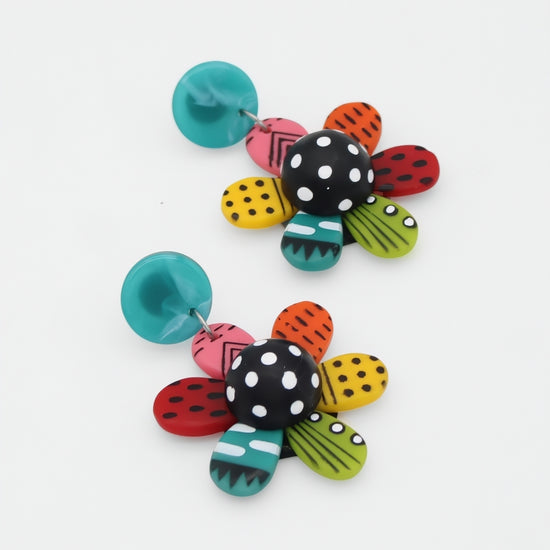 - Hand-painted resin flowers with unique polka dot and stripe details in vibrant colors—no two pairs are exactly alike