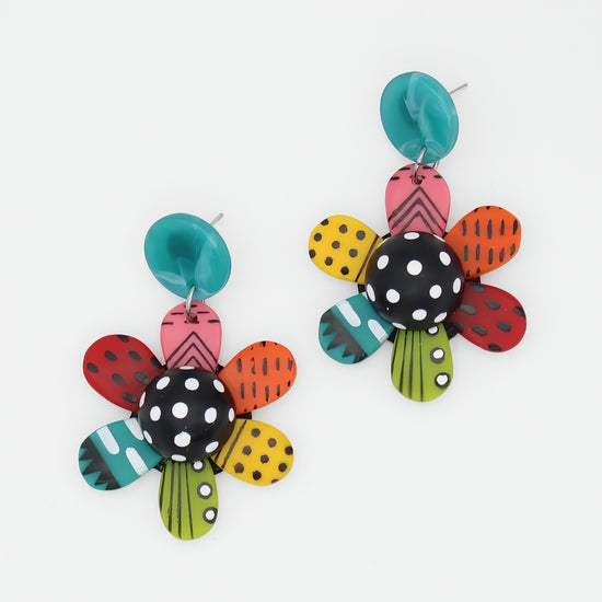 Vibrant Garden of Color Flower Earrings bring joyful energy to your jewelry collection with hand-painted resin blooms featuring playful polka dots and stripes in a vibrant multi-color palette. These lightweight statement earrings add artisan charm and a pop of color to any outfit, from casual weekend looks to festival-ready ensembles.