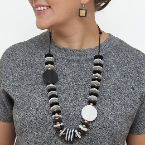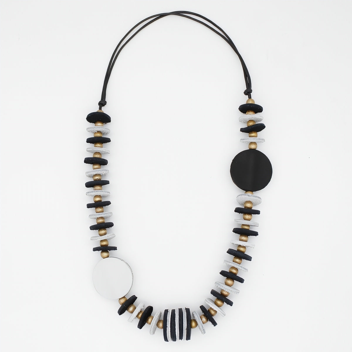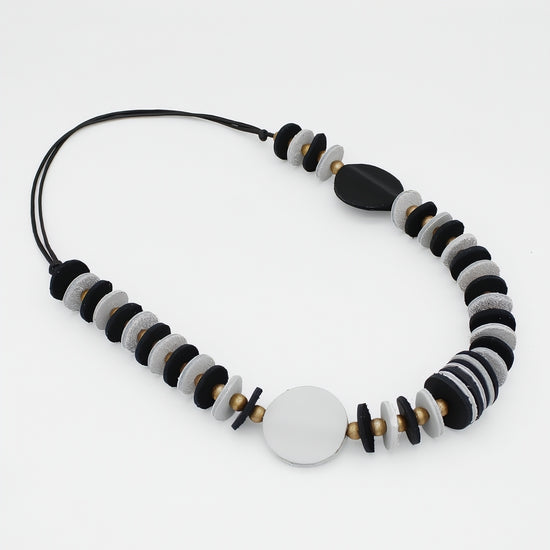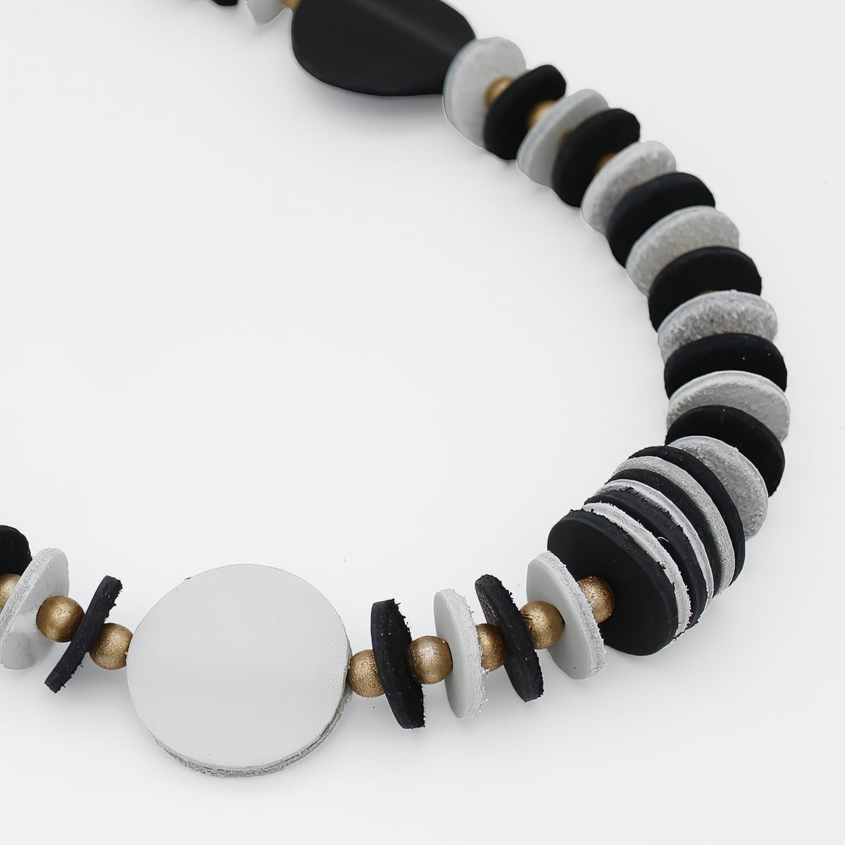 The Vivid Black Leather Necklace features leather disc beads in shades of black and gray thoughtfully spaced with small wooden beads for a balanced, contemporary look. This expert-crafted piece combines natural textures and modern design, making it a refined statement accessory that complements a variety of styles while adding subtle earth-inspired elegance.