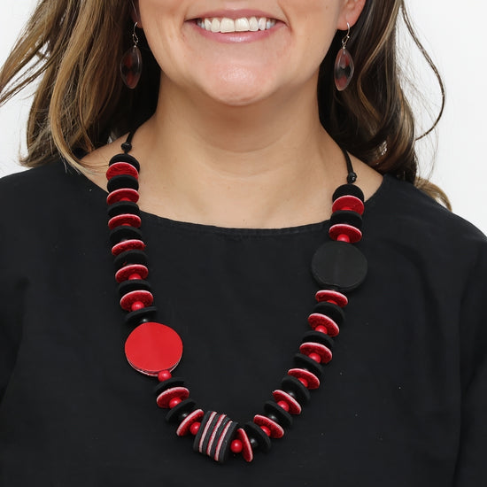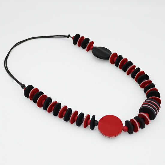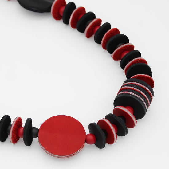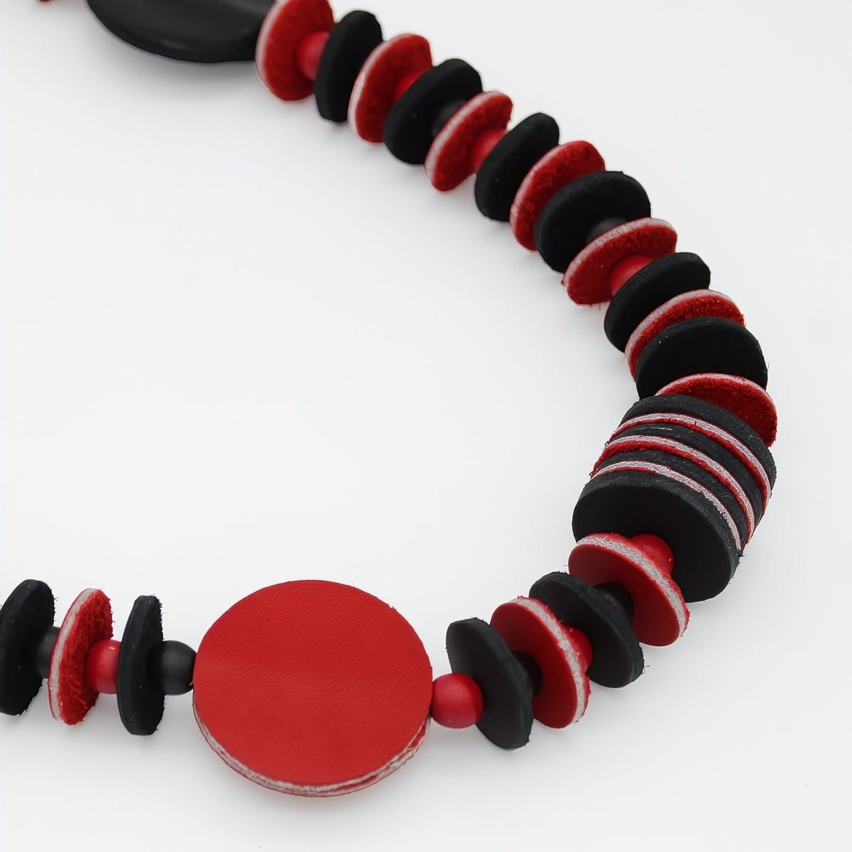 The Vivid Red Leather Necklace features leather disc beads in red and black thoughtfully spaced with small wooden beads for a balanced, contemporary look. This expert-crafted piece combines natural textures and modern design, making it a refined statement accessory that complements a variety of styles while adding subtle earth-inspired elegance.