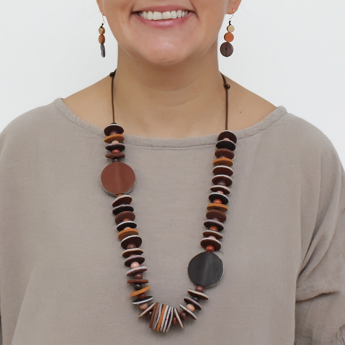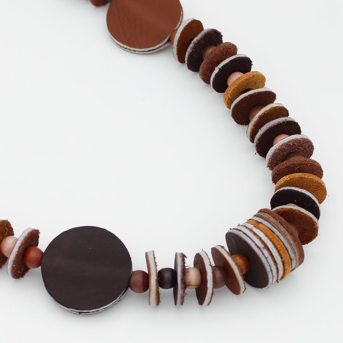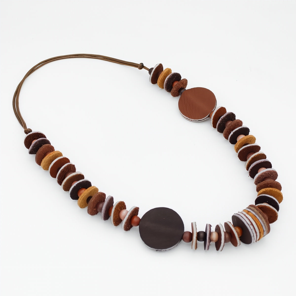 The Vivid Shades of Brown Leather Necklace features leather disc beads in shades of brown thoughtfully spaced with small wooden beads for a balanced, contemporary look. This expert-crafted piece combines natural textures and modern design, making it a refined statement accessory that complements a variety of styles while adding subtle earth-inspired elegance.