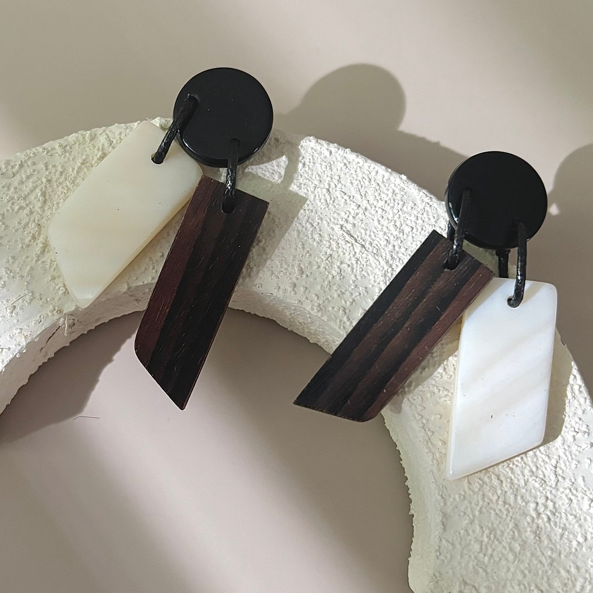Enhance your natural beauty with our Wood and Shell Inlay Aurora Earrings. The rich brown wood and shell inlay, combined with the delicate drop design and post clasp, make these earrings lightweight and easy to wear. Inspired by nature, these brown and white earrings are a must-have for any sophisticated and exclusive look.