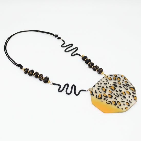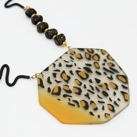 Yellow and Black Leopard Pendant Necklace – A bold, colorful statement piece that brings wild style and handcrafted artistry to any outfit. This eye-catching necklace features a large frosted leopard-print resin bead paired with rubber tubing, round beads, and an adjustable black cord.