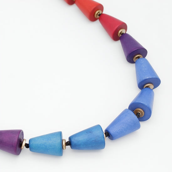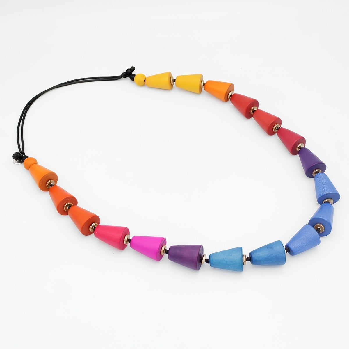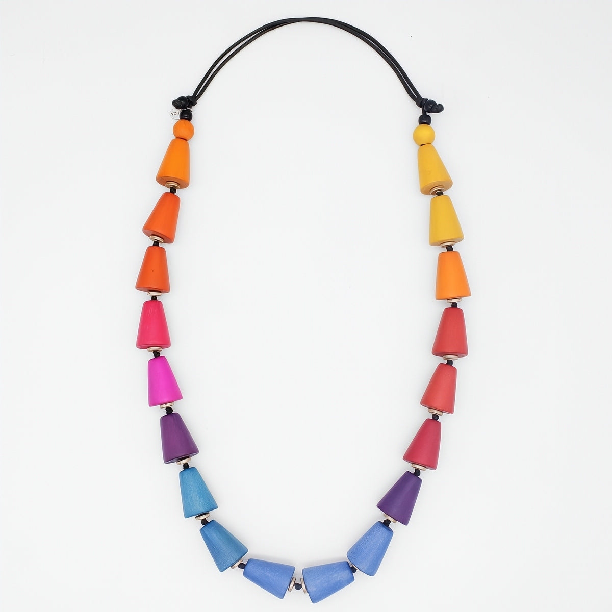 A bold celebration of color and craftsmanship, the Zariah Multi Color Ombre Necklace features beautifully graduated wood beads that flow effortlessly from one vibrant hue to the next. The smooth ombre transition creates a rainbow-inspired statement that feels both playful and polished.